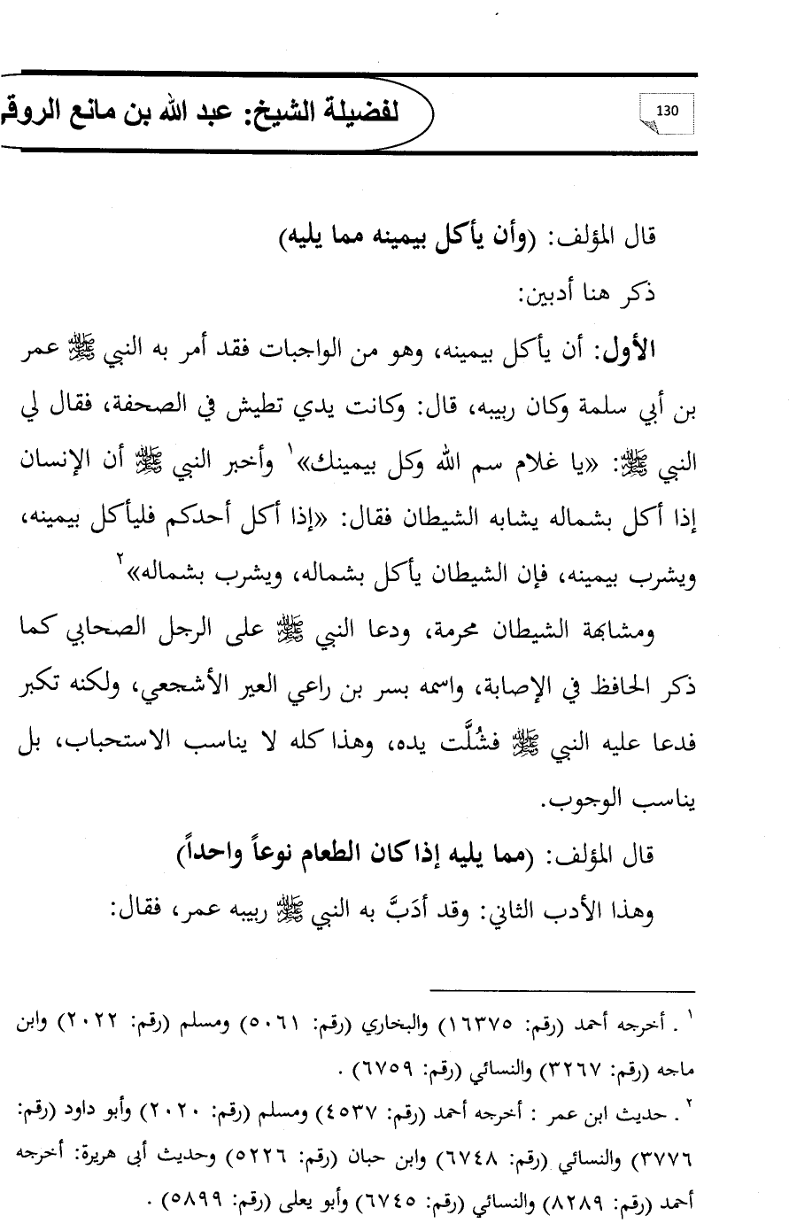 الأول: أن يأكل بيمينه, وهو من الواجبات فقد أمر به النبي - صلى الله عليه وسلم - عمر بن أبي سلمة وكان ربيبه, قال: وكانت يدي تطيش في الصحفة، فقال لي النبي - صلى الله عليه وسلم -: «يا غلام سم الله وكل بيمينك» (¬1) وأخبر النبي - صلى الله عليه وسلم - أن الإنسان إذا أكل بشماله يشابه الشيطان فقال: «إذا أكل أحدكم فليأكل بيمينه، ويشرب بيمينه، فإن الشيطان يأكل بشماله، ويشرب بشماله» (¬2)
