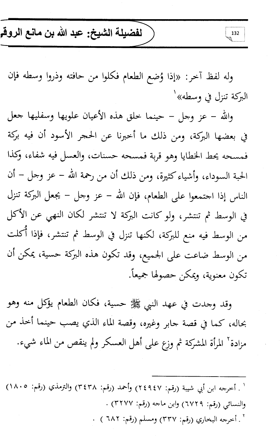 والله - عز وجل - حينما خلق هذه الأعيان علويها وسفليها جعل في بعضها البركة, ومن ذلك ما أخبرنا عن الحجر الأسود أن فيه بركة فمسحه يحط الخطايا وهو قربة فمسحه حسنات, والعسل فيه شفاء, وكذا الحبة السوداء, وأشياء كثيرة, ومن ذلك أن من رحمة الله - عز وجل - أن الناس إذا اجتمعوا على الطعام, فإن الله - عز وجل - يجعل البركة تنزل في الوسط ثم تنتشر, ولو كانت البركة لا تنتشر لكان النهي عن الأكل من الوسط فيه منع للبركة, لكنها تنزل في الوسط ثم تنتشر, فإذا أُكلت من الوسط ضاعت على الجميع, وقد تكون هذه البركة حسية, يمكن أن تكون معنوية، ويمكن حصولها جميعاً.