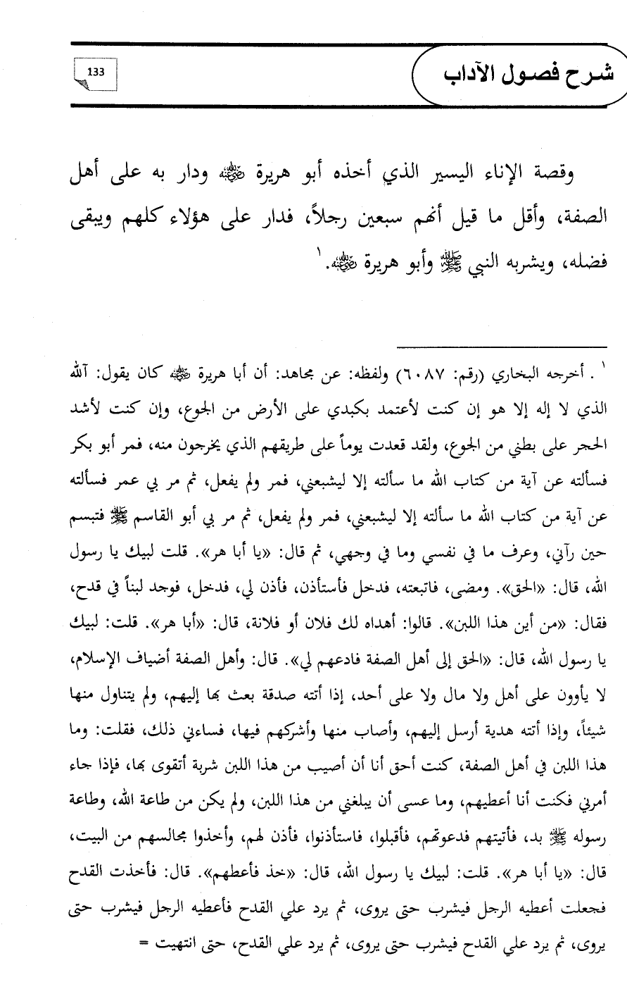 وقصة الإناء اليسير الذي أخذه أبو هريرة - رضي الله عنه - ودار به على أهل الصفة, وأقل ما قيل أنهم سبعين رجلاً, فدار على هؤلاء كلهم ويبقى فضله, ويشربه النبي - صلى الله عليه وسلم - وأبو هريرة - رضي الله عنه -. (¬1)
