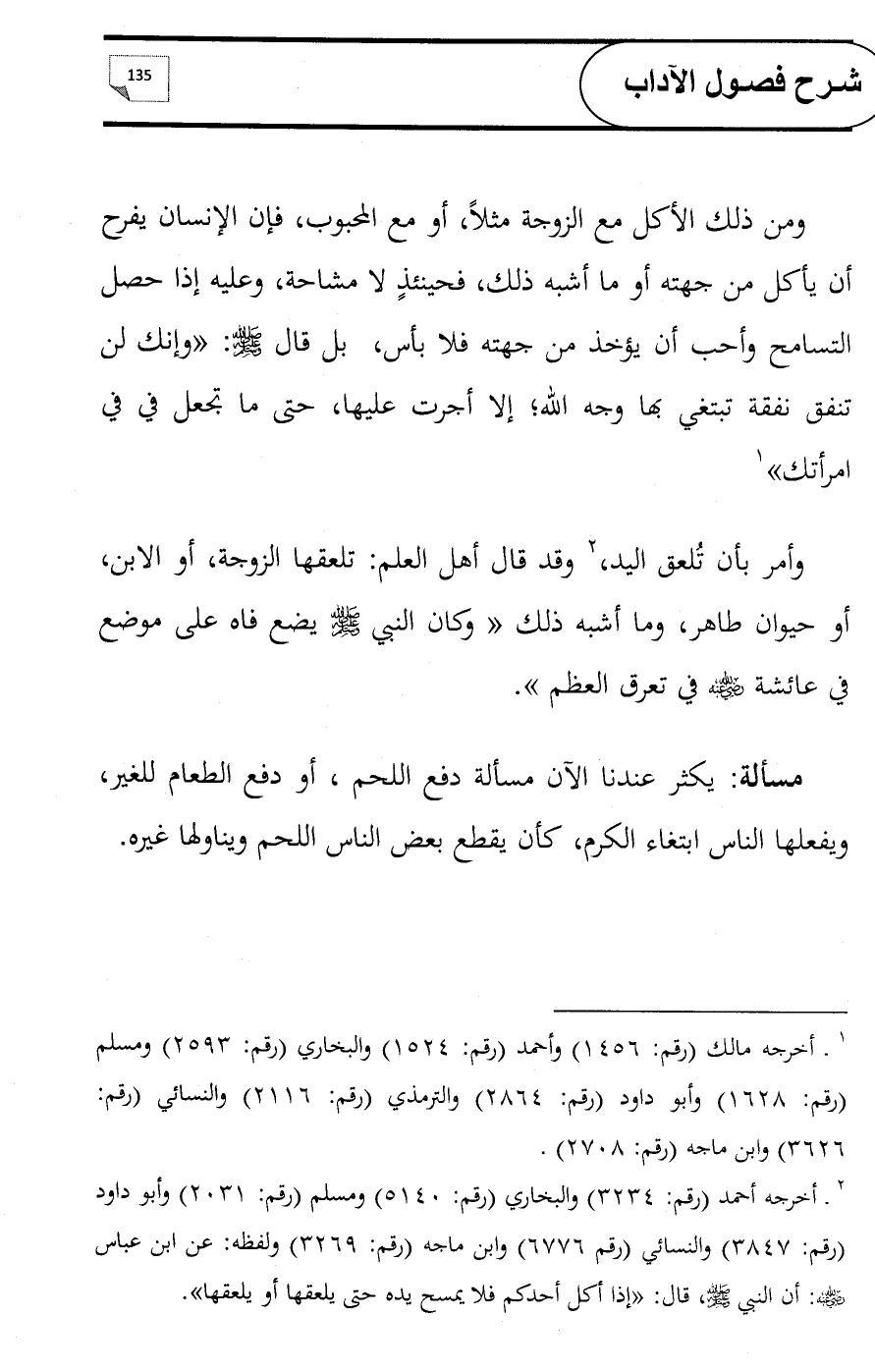ومن ذلك الأكل مع الزوجة مثلاً, أو مع المحبوب, فإن الإنسان يفرح أن يأكل من جهته أو ما أشبه ذلك, فحينئذٍ لا مشاحة, وعليه إذا حصل التسامح وأحب أن يؤخذ من جهته فلا بأس، بل قال - صلى الله عليه وسلم -: «وإنك لن تنفق نفقة تبتغي بها وجه الله؛ إلا أجرت عليها، حتى ما تجعل في في امرأتك» (¬1)