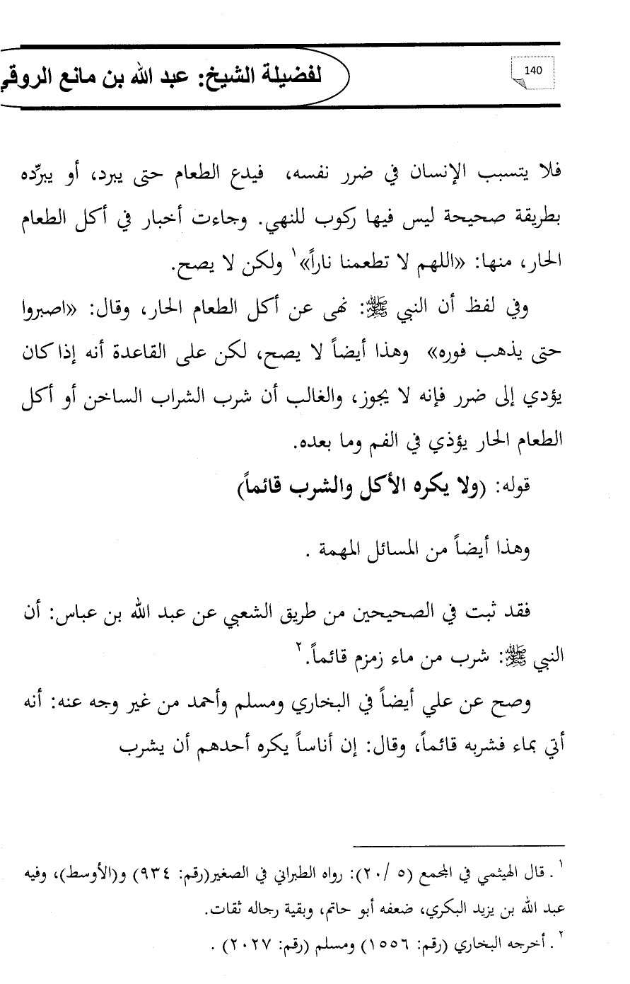 وفي لفظ أن النبي - صلى الله عليه وسلم -: نهى عن أكل الطعام الحار, وقال: «اصبروا حتى يذهب فوره» وهذا أيضاً لا يصح, لكن على القاعدة أنه إذا كان يؤدي إلى ضرر فإنه لا يجوز, والغالب أن شرب الشراب الساخن أو أكل الطعام الحار يؤذي في الفم وما بعده.