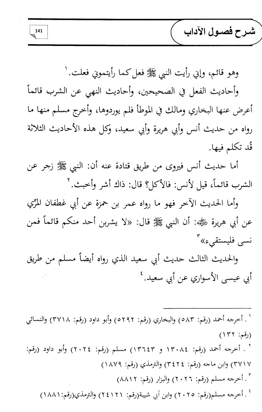 وأحاديث الفعل في الصحيحين, وأحاديث النهي عن الشرب قائماً أعرض عنها البخاري ومالك في الموطأ فلم يوردوها, وأخرج مسلم منها ما رواه من حديث أنس وأبي هريرة وأبي سعيد, وكل هذه الأحاديث الثلاثة قُد تكلم فيها.
