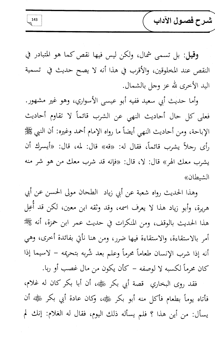 وأما حديث أبي سعيد ففيه أبو عيسى الأسواري, وهو غير مشهور. فعلى كل حال أحاديث النهي عن الشرب قائماً لا تقاوم أحاديث الإباحة, ومن أحاديث النهي أيضاً ما رواه الإمام أحمد وغيره: أن النبي - صلى الله عليه وسلم - رأى رجلاً يشرب قائماً، فقال له: «قه» قال: لمه، قال: «أيسرك أن يشرب معك الهر» قال: لا، قال: «فإنه قد شرب معك من هو شر منه الشيطان»