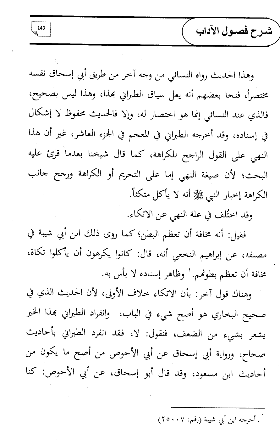 وهذا الحديث رواه النسائي من وجه آخر من طريق أبي إسحاق نفسه مختصراً، فنحا بعضهم أنه يعل سياق الطبراني بهذا، وهذا ليس بصحيح, فالذي عند النسائي إنما هو اختصار له, وإلا فالحديث محفوظ لا إشكال في إسناده, وقد أخرجه الطبراني في المعجم في الجزء العاشر, غير أن هذا النهي على القول الراجح للكراهة, كما قال شيخنا بعدما قرئ عليه البحث؛ لأن صيغة النهي إما على التحريم أو الكراهة ورجح جانب الكراهة إخبار النبي - صلى الله عليه وسلم - أنه لا يأكل متكئاً.