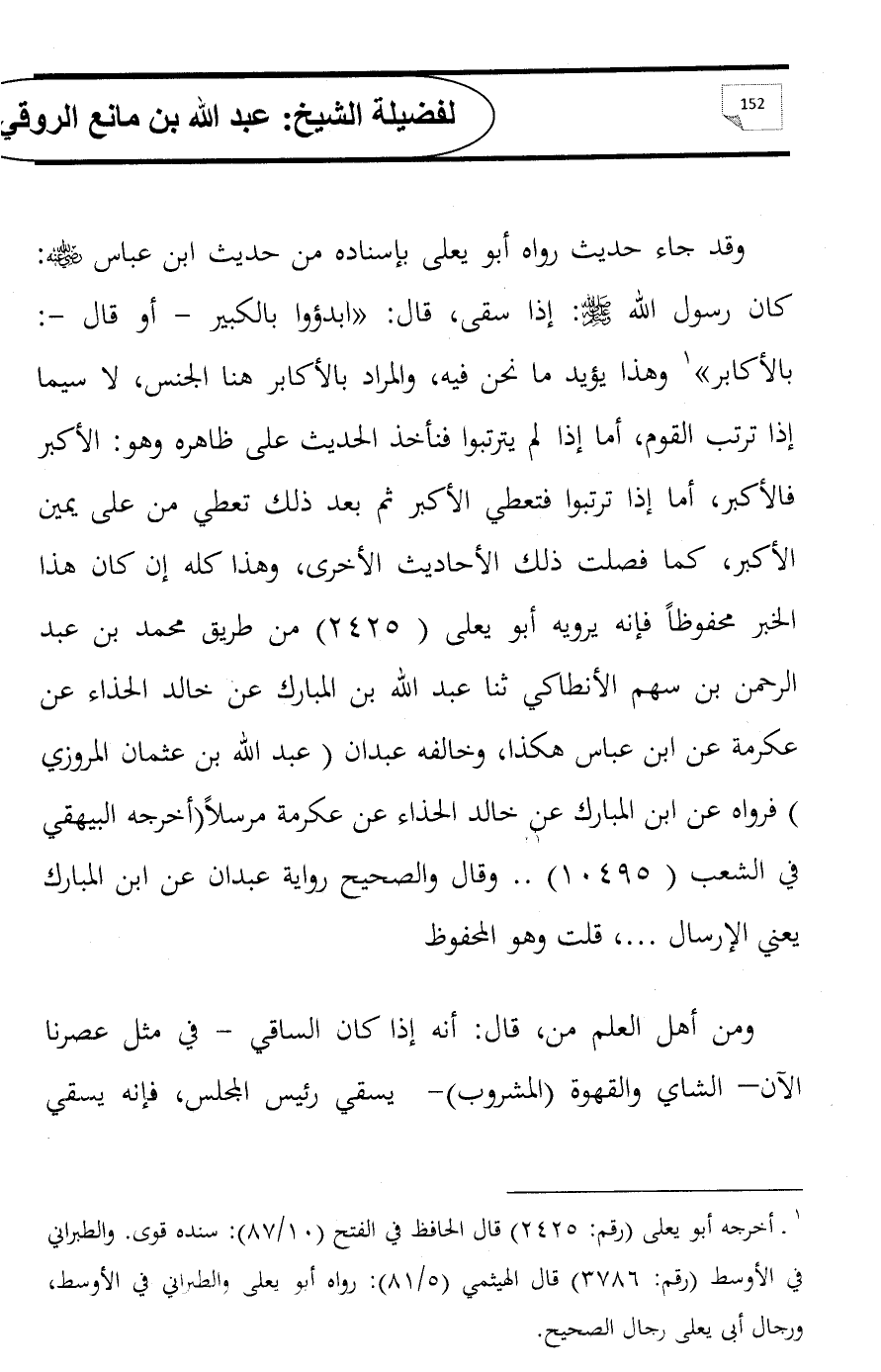 وقد جاء حديث رواه أبو يعلى بإسناده من حديث ابن عباس - رضي الله عنه -: كان رسول الله - صلى الله عليه وسلم -: إذا سقى، قال: «ابدؤوا بالكبير - أو قال -: بالأكابر» (¬1) وهذا يؤيد ما نحن فيه, والمراد بالأكابر هنا الجنس, لا سيما إذا ترتب القوم, أما إذا لم يترتبوا فنأخذ الحديث على ظاهره وهو: الأكبر فالأكبر, أما إذا ترتبوا فتعطي الأكبر ثم بعد ذلك تعطي من على يمين الأكبر, كما فصلت ذلك الأحاديث الأخرى، وهذا كله إن كان هذا الخبر محفوظاً فإنه يرويه أبو يعلى (2425) من طريق محمد بن عبد الرحمن بن سهم الأنطاكي ثنا عبد الله بن المبارك عن خالد الحذاء عن عكرمة عن ابن عباس هكذا، وخالفه عبدان (عبد الله بن عثمان المروزي) فرواه عن ابن المبارك عن خالد الحذاء عن عكرمة مرسلاً (أخرجه البيهقي في الشعب (10495) .. وقال والصحيح رواية عبدان عن ابن المبارك يعني الإرسال ... ، قلت وهو المحفوظ