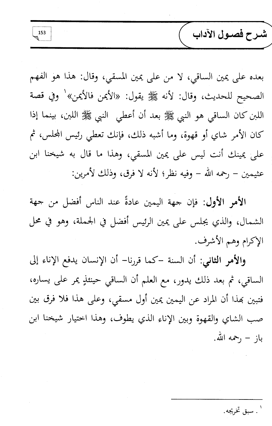 بعده على يمين الساقي، لا من على يمين المسقي, وقال: هذا هو الفهم الصحيح للحديث, وقال: لأنه - صلى الله عليه وسلم - يقول: «الأيمن فالأيمن» (¬1) وفي قصة اللبن كان الساقي هو النبي - صلى الله عليه وسلم - بعد أن أعطي النبي - صلى الله عليه وسلم - اللبن, بينما إذا كان الأمر شاي أو قهوة، وما أشبه ذلك، فإنك تعطي رئيس المجلس، ثم على يمينك أنت ليس على يمين المسقي, وهذا ما قال به شيخنا ابن عثيمين - رحمه الله - وفيه نظر؛ لأنه لا فرق، وذلك لأمرين: