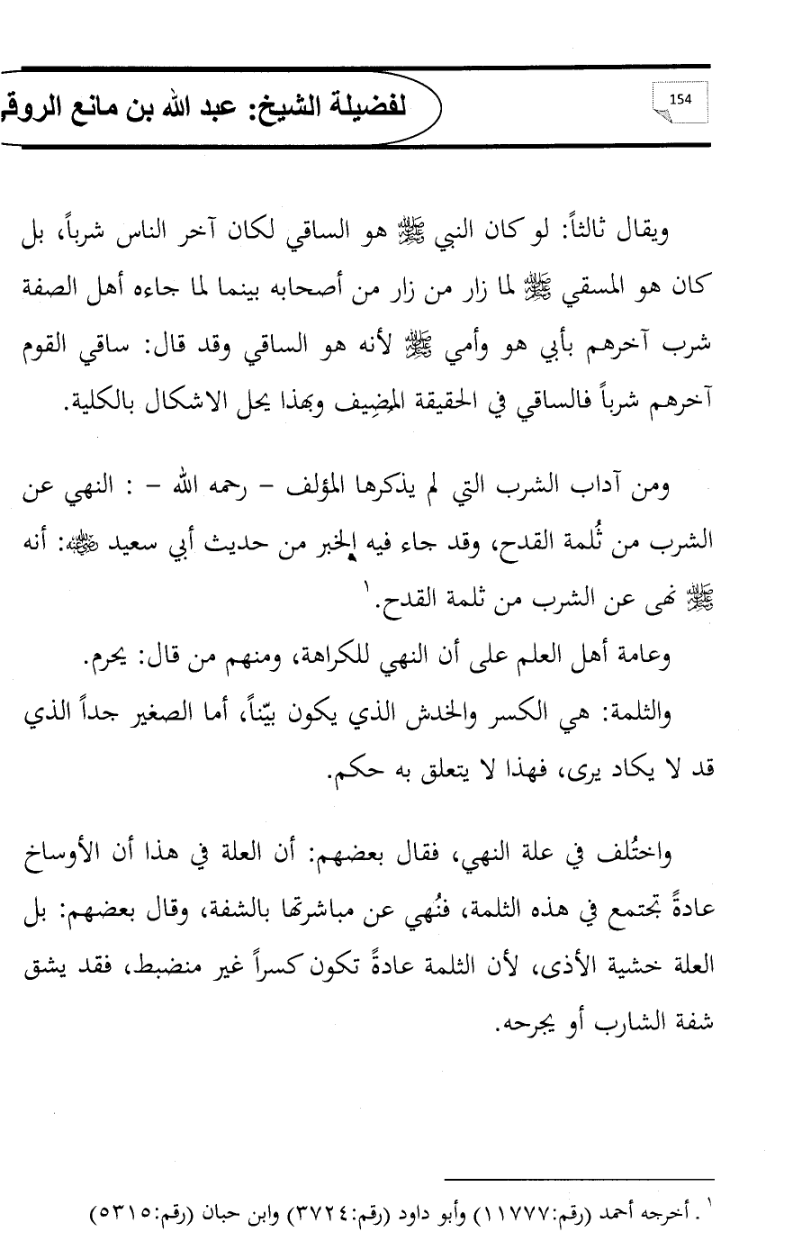 ومن آداب الشرب التي لم يذكرها المؤلف - رحمه الله -: النهي عن الشرب من ثُلمة القدح, وقد جاء فيه الخبر من حديث أبي سعيد - رضي الله عنه -: أنه - صلى الله عليه وسلم - نهى عن الشرب من ثلمة القدح. (¬1)