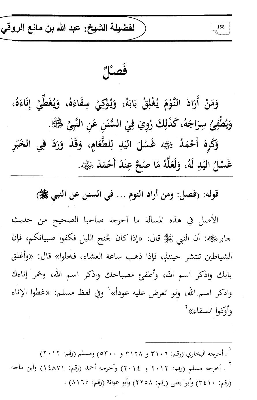 وَمَنْ أَرَادَ النَّوْمَ يُغْلِقُ بَابَهُ، وَيُوْكِيْ سِقَاءَهُ، وَيُغَطِّيْ إِنَاءَهُ، وَيُطْفِئُ سِرَاجَهُ، كَذَلِكَ رُوِيَ فِيْ السُّنَنِ عَنِ النَّبِيِّ - صلى الله عليه وسلم -.