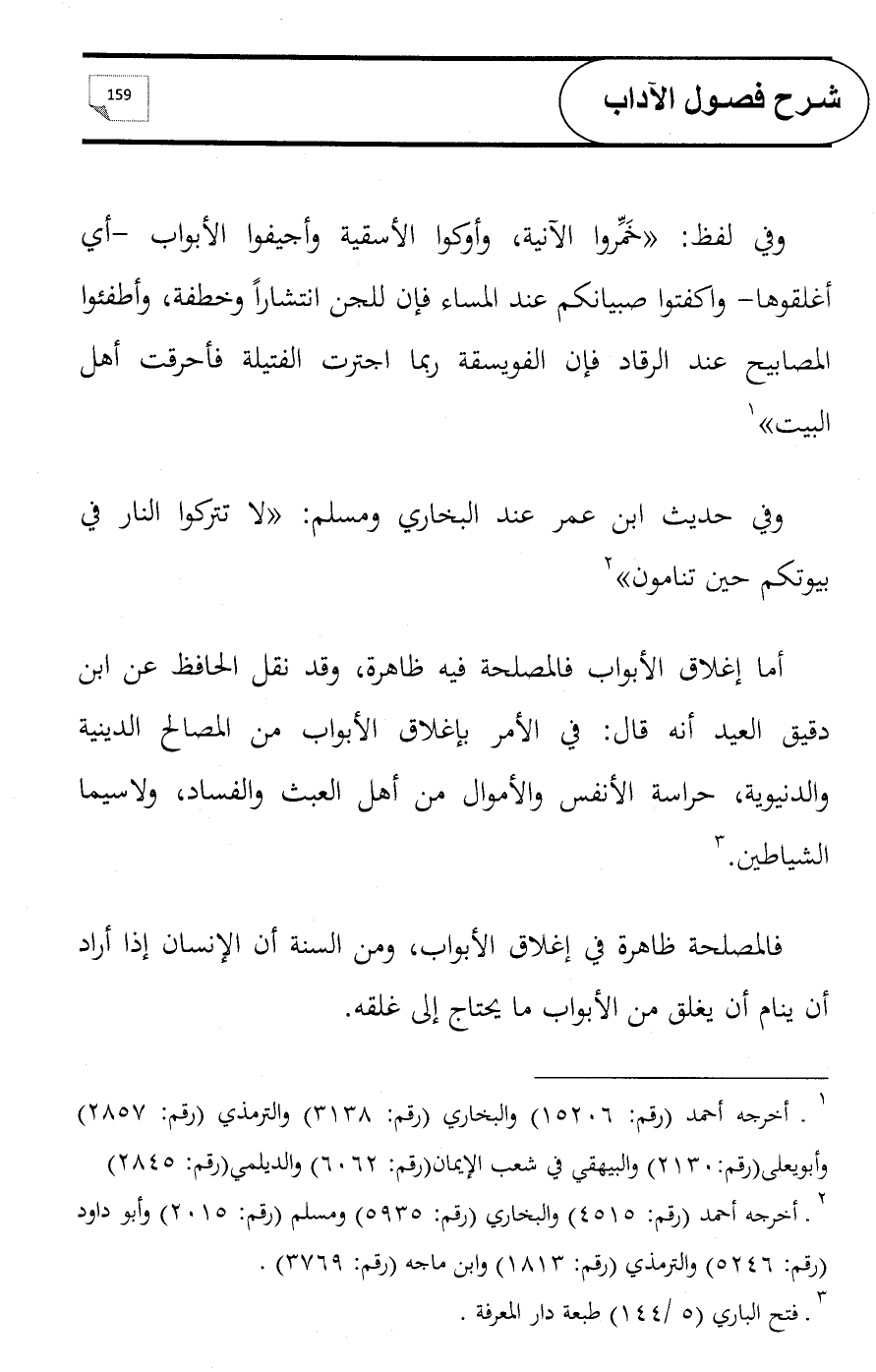أما إغلاق الأبواب فالمصلحة فيه ظاهرة, وقد نقل الحافظ عن ابن دقيق العيد أنه قال: في الأمر بإغلاق الأبواب من المصالح الدينية والدنيوية، حراسة الأنفس والأموال من أهل العبث والفساد, ولاسيما الشياطين. (¬3)