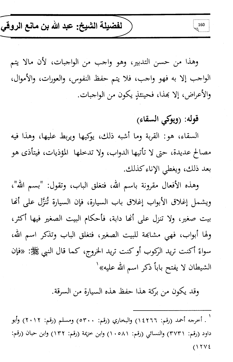 وهذه الأفعال مقرونة باسم الله, فتغلق الباب، وتقول: "بسم الله", ويشمل إغلاق الأبواب إغلاق باب السيارة, فإن السيارة تُنزَّل على أنها بيت صغير, ولا تنزل على أنها دابة, فأحكام البيت الصغير فيها أكثر, ولها أبواب, فهي مشابهة للبيت الصغير, فتغلق الباب وتذكر اسم الله, سواءً أكنت تريد الركوب أو كنت تريد الخروج, كما قال النبي - صلى الله عليه وسلم -: «فإن الشيطان لا يفتح باباً ذكر اسم الله عليه» (¬1)