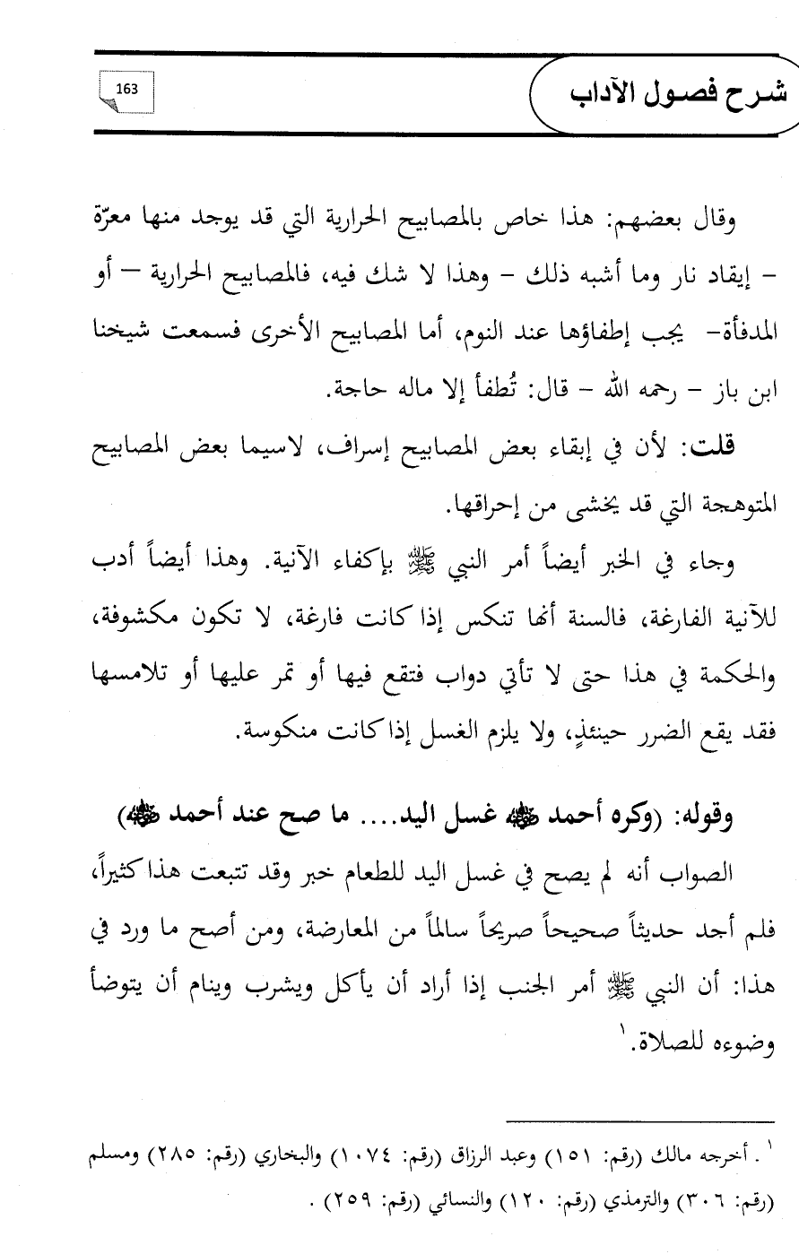 وقال بعضهم: هذا خاص بالمصابيح الحرارية التي قد يوجد منها معرّة - إيقاد نار وما أشبه ذلك - وهذا لا شك فيه, فالمصابيح الحرارية - أو المدفأة- يجب إطفاؤها عند النوم, أما المصابيح الأخرى فسمعت شيخنا ابن باز - رحمه الله - قال: تُطفأ إلا ماله حاجة.