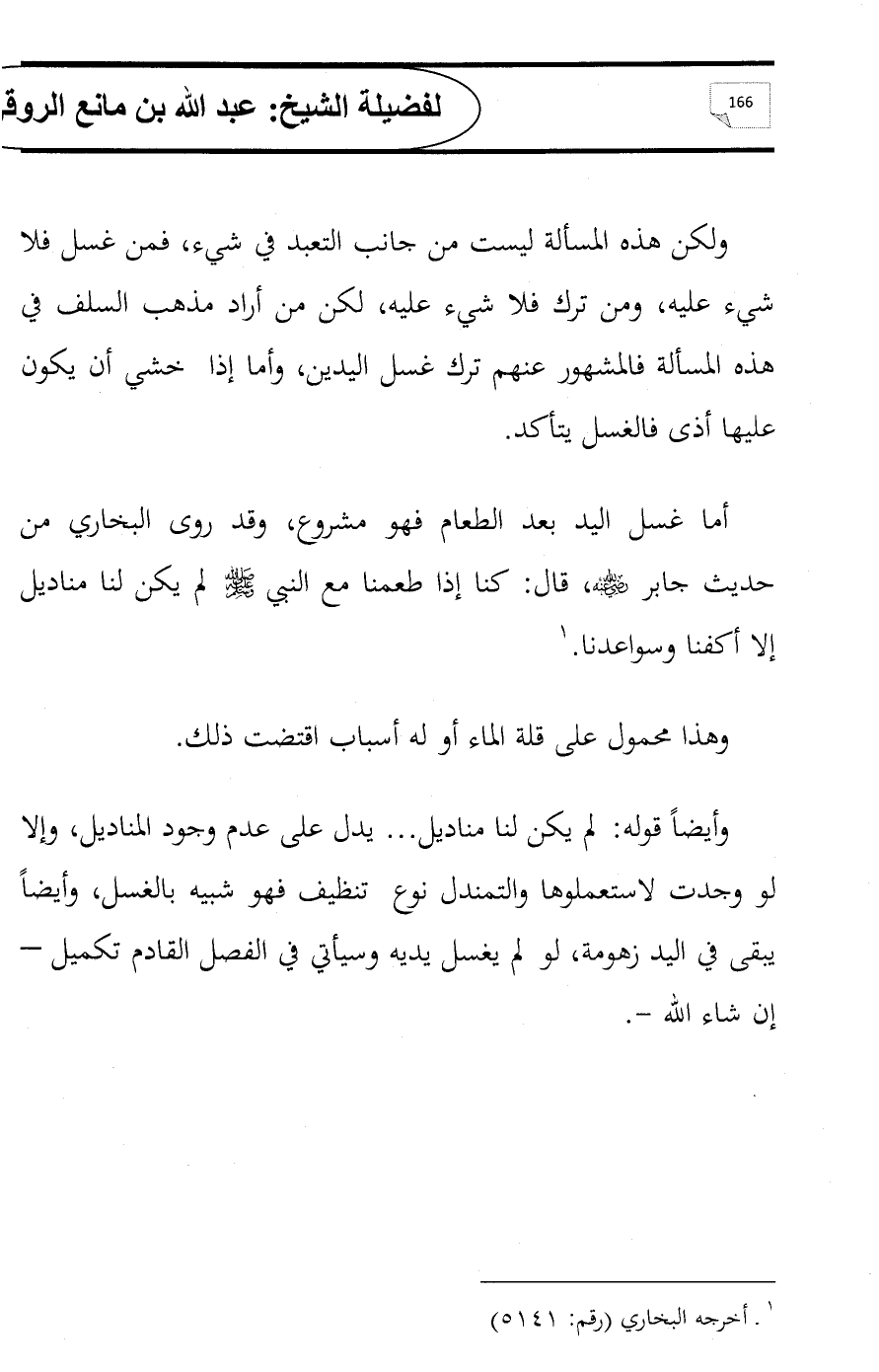وأيضاً قوله: لم يكن لنا مناديل ... يدل على عدم وجود المناديل، وإلا لو وجدت لاستعملوها والتمندل نوع تنظيف فهو شبيه بالغسل، وأيضاً يبقى في اليد زهومة، لو لم يغسل يديه وسيأتي في الفصل القادم تكميل - إن شاء الله -.