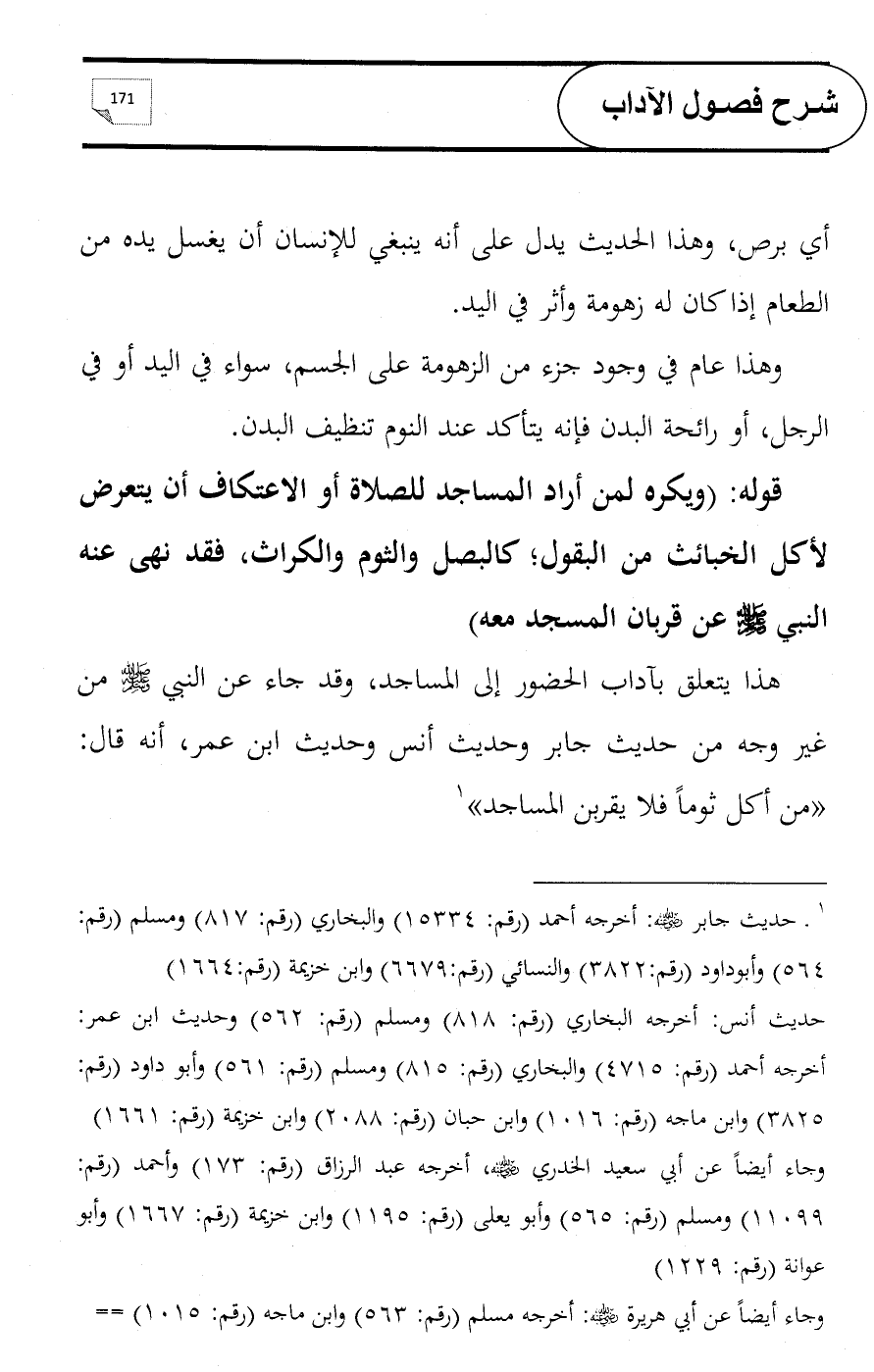 هذا يتعلق بآداب الحضور إلى المساجد, وقد جاء عن النبي - صلى الله عليه وسلم - من غير وجه من حديث جابر وحديث أنس وحديث ابن عمر، أنه قال: «من أكل ثوماً فلا يقربن المساجد» (¬1)
