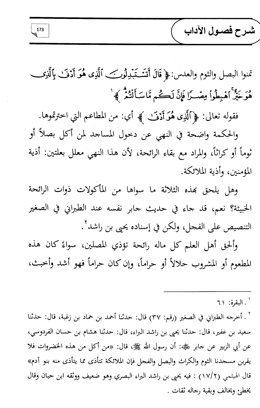 (¬2) أخرجه الطبراني في الصغير (رقم: 37) قال: حدثنا أحمد بن حماد بن زغبة، قال: حدثنا سعيد بن عفير، قال: حدثنا يحيى بن راشد البراء، قال: حدثنا هشام بن حسان الفردوسي، عن أبي الزبير عن جابر - رضي الله عنه -: أن رسول الله - صلى الله عليه وسلم -، قال: «من أكل من هذه الخضروات فلا يقربن مسجدنا الثوم والكراث والبصل والفجل فإن الملائكة تتأذى مما يتأذى منه بنو آدم» قال الهيثمي (2/ 17): فيه يحيى بن راشد البراء البصري وهو ضعيف ووثقه ابن حبان وقال يخطئ ويخالف وبقية رجاله ثقات.
