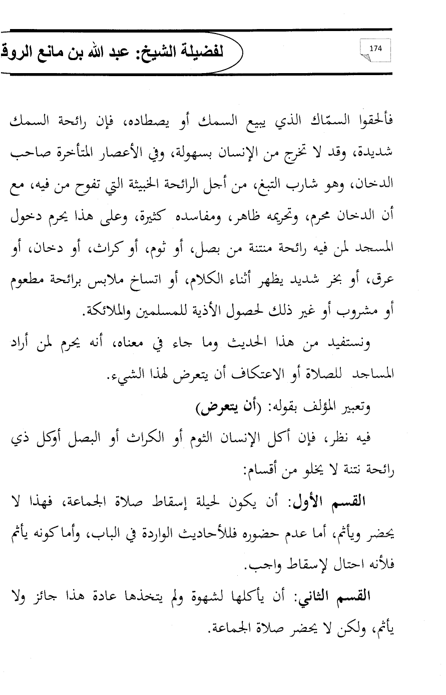 فألحقوا السمّاك الذي يبيع السمك أو يصطاده, فإن رائحة السمك شديدة, وقد لا تخرج من الإنسان بسهولة, وفي الأعصار المتأخرة صاحب الدخان, وهو شارب التبغ, من أجل الرائحة الخبيثة التي تفوح من فيه, مع أن الدخان محرم, وتحريمه ظاهر, ومفاسده كثيرة، وعلى هذا يحرم دخول المسجد لمن فيه رائحة منتنة من بصل, أو ثوم, أو كراث, أو دخان, أو عرق, أو بخر شديد يظهر أثناء الكلام, أو اتساخ ملابس برائحة مطعوم أو مشروب أو غير ذلك لحصول الأذية للمسلمين والملائكة.