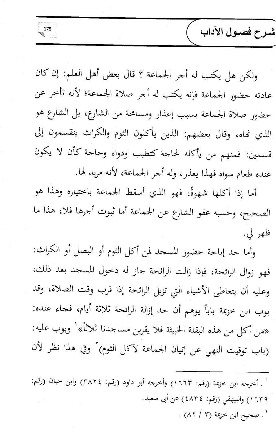 ولكن هل يكتب له أجر الجماعة؟ قال بعض أهل العلم: إن كان عادته حضور الجماعة فإنه يكتب له أجر صلاة الجماعة؛ لأنه تأخر عن حضور صلاة الجماعة بسبب إعذار ومسامحة من الشارع, بل الشارع هو الذي نهاه, وقال بعضهم: الذين يأكلون الثوم والكراث ينقسمون إلى قسمين: فمنهم من يأكله لحاجة كتطبب ودواء وحاجة كأن لا يكون عنده طعام سواه فهذا يعذر, وله أجر الجماعة, لأنه مريد لها.