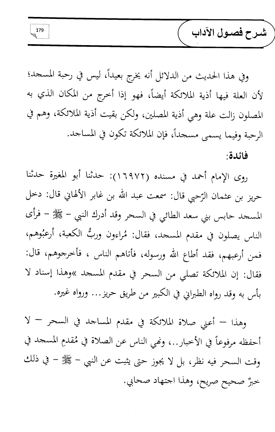 وهذا - أعني صلاة الملائكة في مقدم المساجد في السحر - لا أحفظه مرفوعاً في الأخبار .. ، ونهي الناس عن الصلاة في مُقدمِ المسجد في وقت السحر فيه نظر، بل لا يجوز حتى يثبت عن النبي - صلى الله عليه وسلم - في ذلك خبرٌ صحيح صريح، وهذا اجتهاد صحابي.
