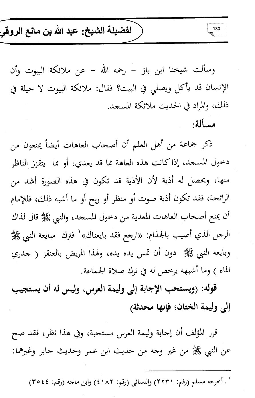 ذكر جماعة من أهل العلم أن أصحاب العاهات أيضاً يمنعون من دخول المسجد, إذا كانت هذه العاهة مما قد يعدي, أو مما يتقزز الناظر منها, ويحصل له أذية لأن الأذية قد تكون في هذه الصورة أشد من الرائحة، فقد تكون أذية صوت أو منظر أو ريح أو ما أشبه ذلك, فللإمام أن يمنع أصحاب العاهات المعدية من دخول المسجد, والنبي - صلى الله عليه وسلم - قال لذاك الرجل الذي أصيب بالجذام: «ارجع فقد بايعناك» (¬1) فترك مبايعة النبي - صلى الله عليه وسلم - وبايعه النبي - صلى الله عليه وسلم - دون أن تمس يده يده، ولهذا المريض بالعنقز (جدري الماء) وما أشبهه يرخص له في ترك صلاة الجماعة.