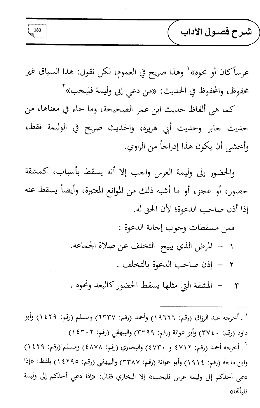 (¬2) أخرجه أحمد (رقم: 4712 و 4730) والبخاري (رقم: 4878) ومسلم (رقم: 1429) وابن ماجه (رقم: 1914) وأبو عوانة (رقم: 3387) والبيهقي (رقم: 14295) بلفظ: «إذا دعي أحدكم إلى وليمة عرس فليجب» إلا البخاري فقال: «إذا دعي أحدكم إلى وليمة فليأتها».