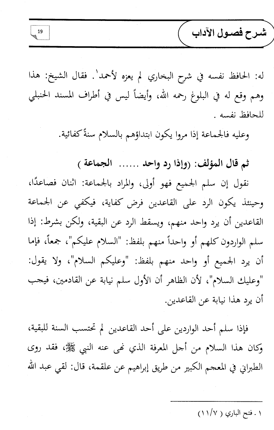 نقول إن سلم الجميع فهو أولى، والمراد بالجماعة: اثنان فصاعدًا, وحينئذ يكون الرد على القاعدين فرض كفاية, فيكفي عن الجماعة القاعدين أن يرد واحد منهم, ويسقط الرد عن البقية, ولكن بشرط: إذا سلم الواردون كلهم أو واحداً منهم بلفظ: "السلام عليكم", جمعاً, فإما أن يرد الجميع أو واحد منهم بلفظ: "وعليكم السلام", ولا يقول: "وعليك السلام", لأن الظاهر أن الأول سلم نيابة عن القادمين, فيجب أن يرد هذا نيابة عن القاعدين.
