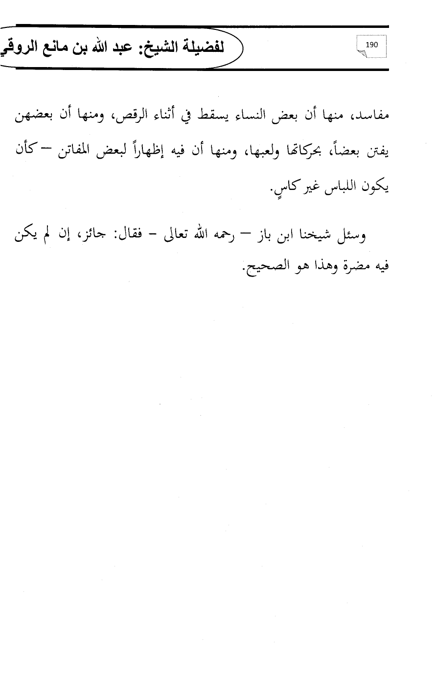 مفاسد, منها أن بعض النساء يسقط في أثناء الرقص, ومنها أن بعضهن يفتن بعضاً, بحركاتها ولعبها, ومنها أن فيه إظهاراً لبعض المفاتن - كأن يكون اللباس غير كاسٍ.