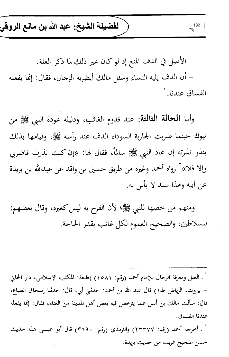 وأما الحالة الثالثة: عند قدوم الغائب، ودليله عودة النبي - صلى الله عليه وسلم - من تبوك حينما ضربت الجارية السوداء الدف عند رأسه - صلى الله عليه وسلم -، وقيامها بذلك بنذر نذرته إن عاد النبي - صلى الله عليه وسلم - سالماً، فقال لها: «إن كنت نذرت فاضربي وإلا فلا» (¬2) رواه أحمد وغيره من طريق حسين بن واقد عن عبدالله بن بريدة عن أبيه وهذا سند لا بأس به.