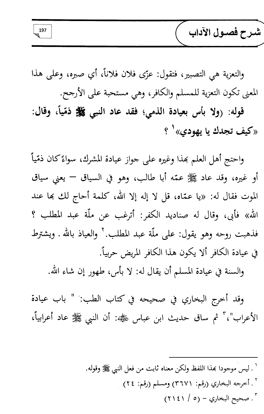 واحتج أهل العلم بهذا وغيره على جواز عيادة المشرك, سواءً كان ذمّياً أو غيره, وقد عاد - صلى الله عليه وسلم - عمّه أبا طالب, وهو في السياق - يعني سياق الموت فقال له: «يا عمّاه, قل لا إله إلا الله, كلمة أحاج لك بها عند الله» فأبى، وقال له صناديد الكفر: أترغب عن ملّة عبد المطلب؟ فذهبت روحه وهو يقول: على ملّة عبد المطلب. (¬2) والعياذ بالله ـ ويشترط في عيادة الكافر ألا يكون هذا الكافر المريض حربياً.