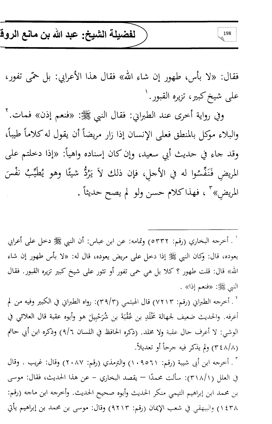 (¬1) أخرجه البخاري (رقم: 5332) وتمامه: عن ابن عباس: أن النبي - صلى الله عليه وسلم - دخل على أعرابي يعوده، قال: وكان النبي - صلى الله عليه وسلم - إذا دخل على مريض يعوده، قال له: «لا بأس طهور إن شاء الله» قال: قلت طهور؟ كلا بل هي حمى تفور أو تثور على شيخ كبير تزيره القبور. فقال النبي - صلى الله عليه وسلم -: «فنعم إذا».
