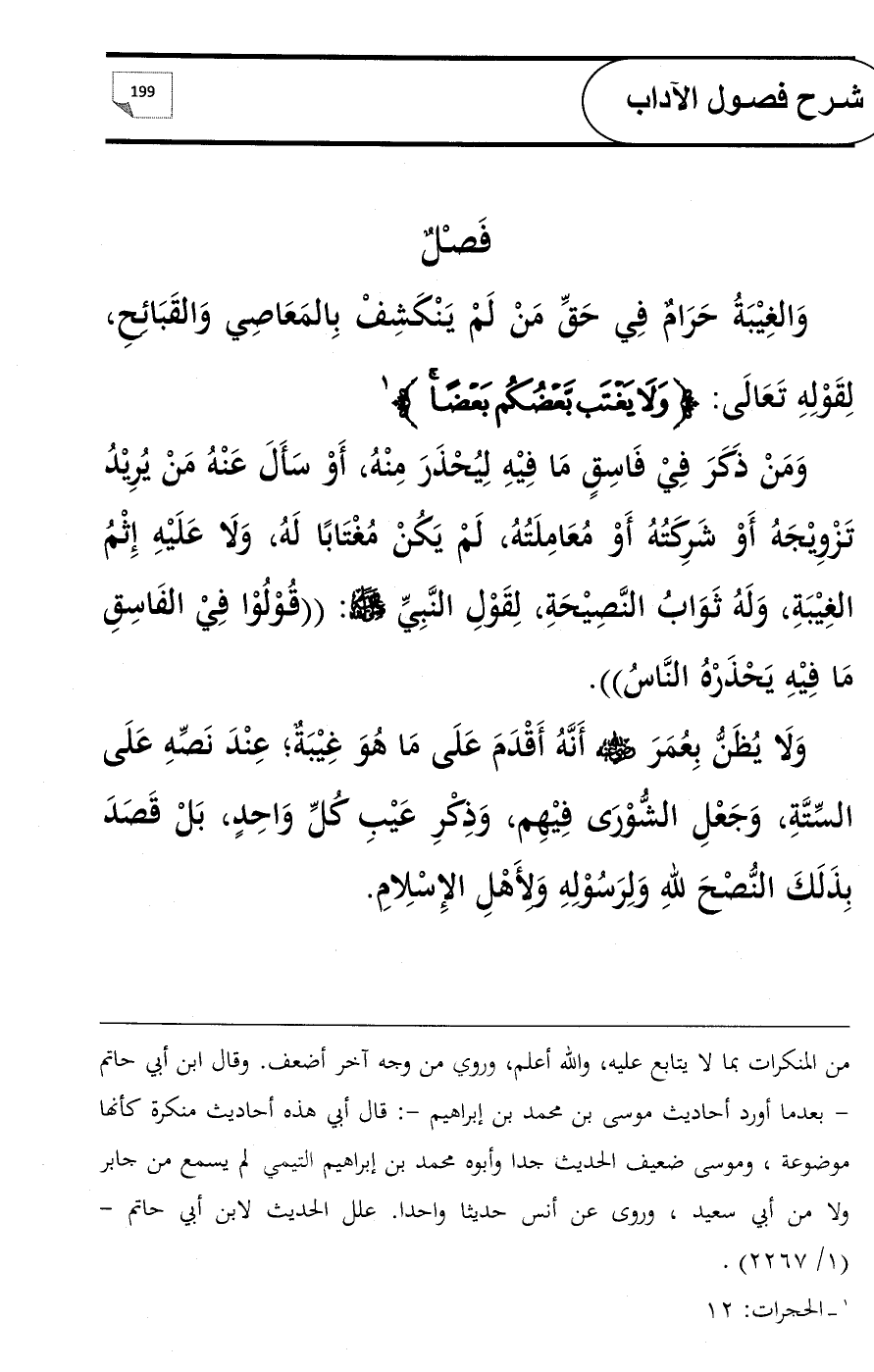 وَالغِيْبَةُ حَرَامٌ فِي حَقِّ مَنْ لَمْ يَنْكَشِفْ بِالمَعَاصِي وَالقَبَائِحِ، لِقَوْلِهِ تَعَالَى: {وَلَا يَغْتَبْ بَعْضُكُمْ بَعْضًا} (¬1)