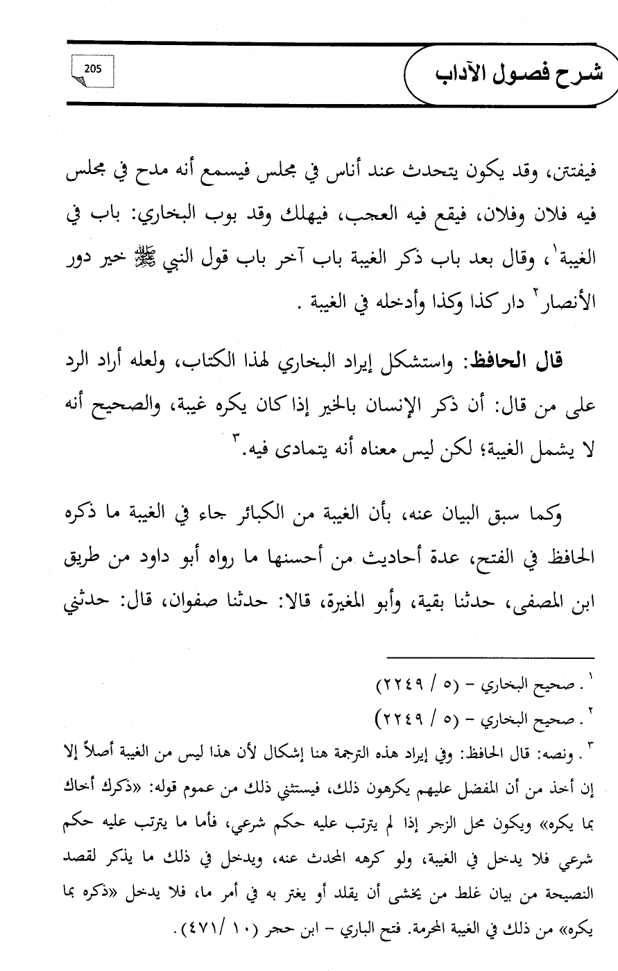 (¬3) ونصه: قال الحافظ: وفي إيراد هذه الترجمة هنا إشكال لأن هذا ليس من الغيبة أصلاً إلا إن أخذ من أن المفضل عليهم يكرهون ذلك، فيستثني ذلك من عموم قوله: «ذكرك أخاك بما يكره» ويكون محل الزجر إذا لم يترتب عليه حكم شرعي، فأما ما يترتب عليه حكم شرعي فلا يدخل في الغيبة، ولو كرهه المحدث عنه، ويدخل في ذلك ما يذكر لقصد النصيحة من بيان غلط من يخشى أن يقلد أو يغتر به في أمر ما، فلا يدخل «ذكره بما يكره» من ذلك في الغيبة المحرمة. فتح الباري - ابن حجر (10/ 471).