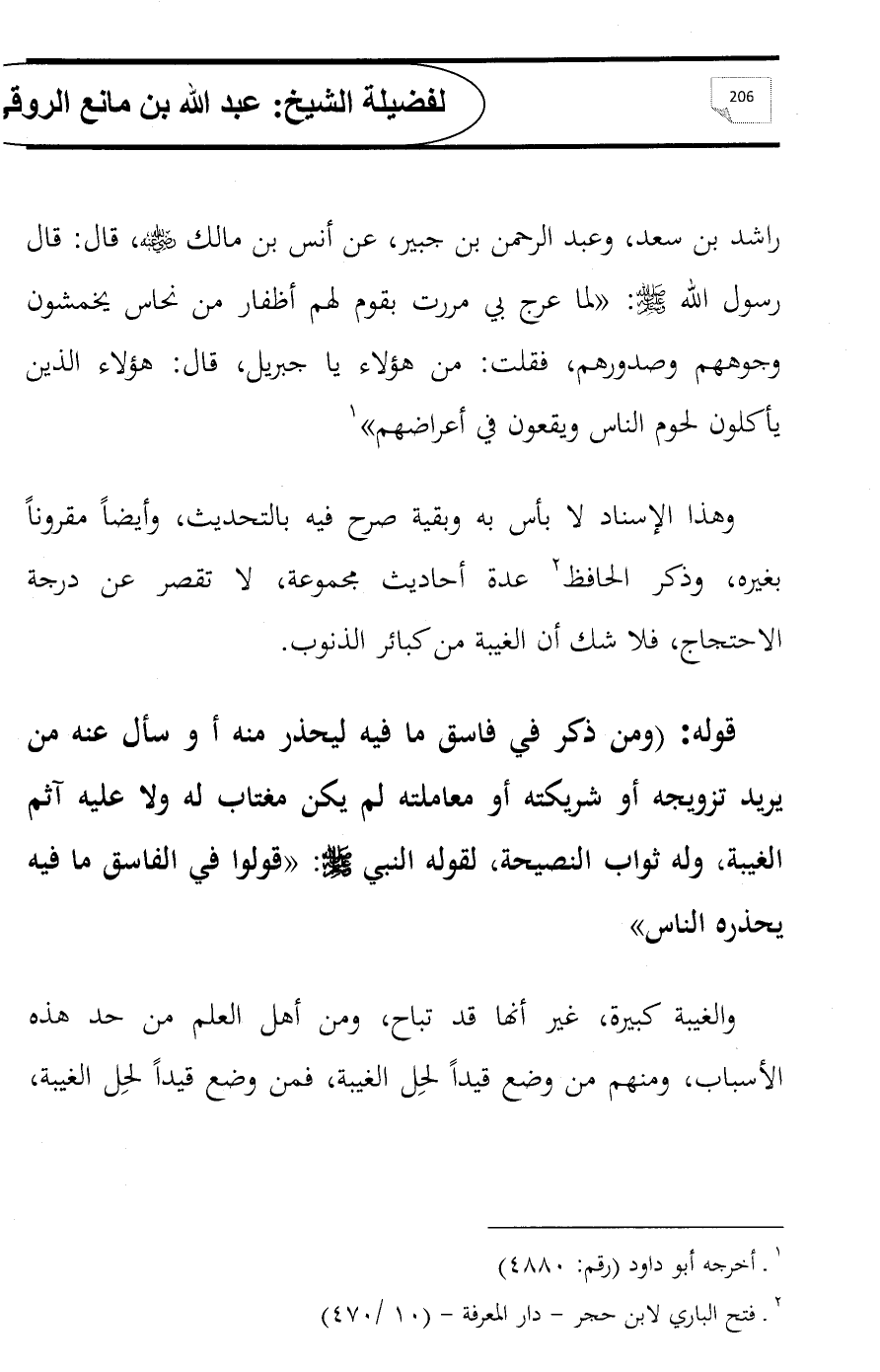 راشد بن سعد، وعبد الرحمن بن جبير، عن أنس بن مالك - رضي الله عنه -، قال: قال رسول الله - صلى الله عليه وسلم -: «لما عرج بي مررت بقوم لهم أظفار من نحاس يخمشون وجوههم وصدورهم، فقلت: من هؤلاء يا جبريل، قال: هؤلاء الذين يأكلون لحوم الناس ويقعون في أعراضهم» (¬1)