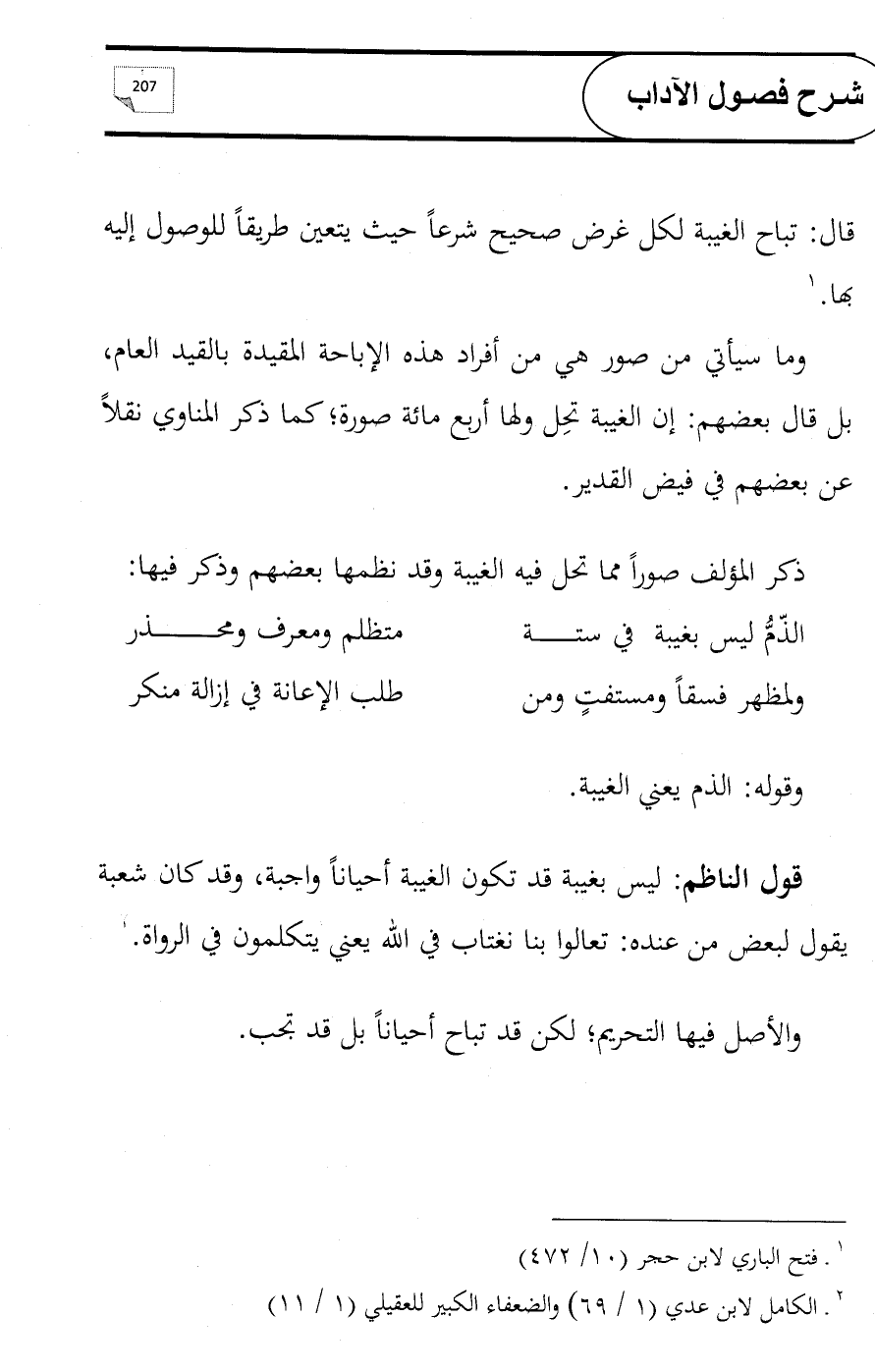 قول الناظم: ليس بغيبة قد تكون الغيبة أحياناً واجبة، وقد كان شعبة يقول لبعض من عنده: تعالوا بنا نغتاب في الله يعني يتكلمون في الرواة. (¬2)
