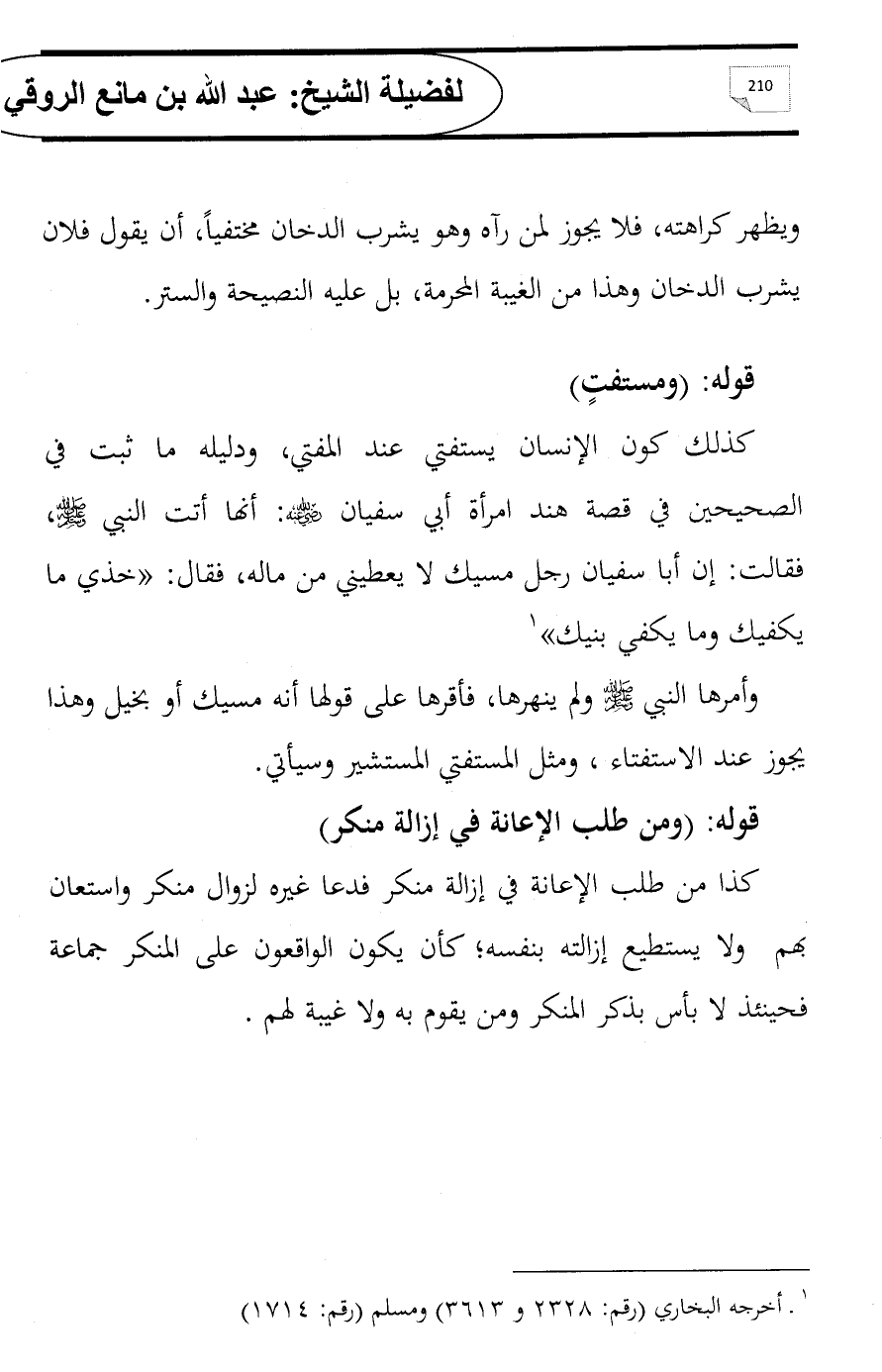 كذلك كون الإنسان يستفتي عند المفتي، ودليله ما ثبت في الصحيحين في قصة هند امرأة أبي سفيان - رضي الله عنه -: أنها أتت النبي - صلى الله عليه وسلم -، فقالت: إن أبا سفيان رجل مسيك لا يعطيني من ماله، فقال: «خذي ما يكفيك وما يكفي بنيك» (¬1)
