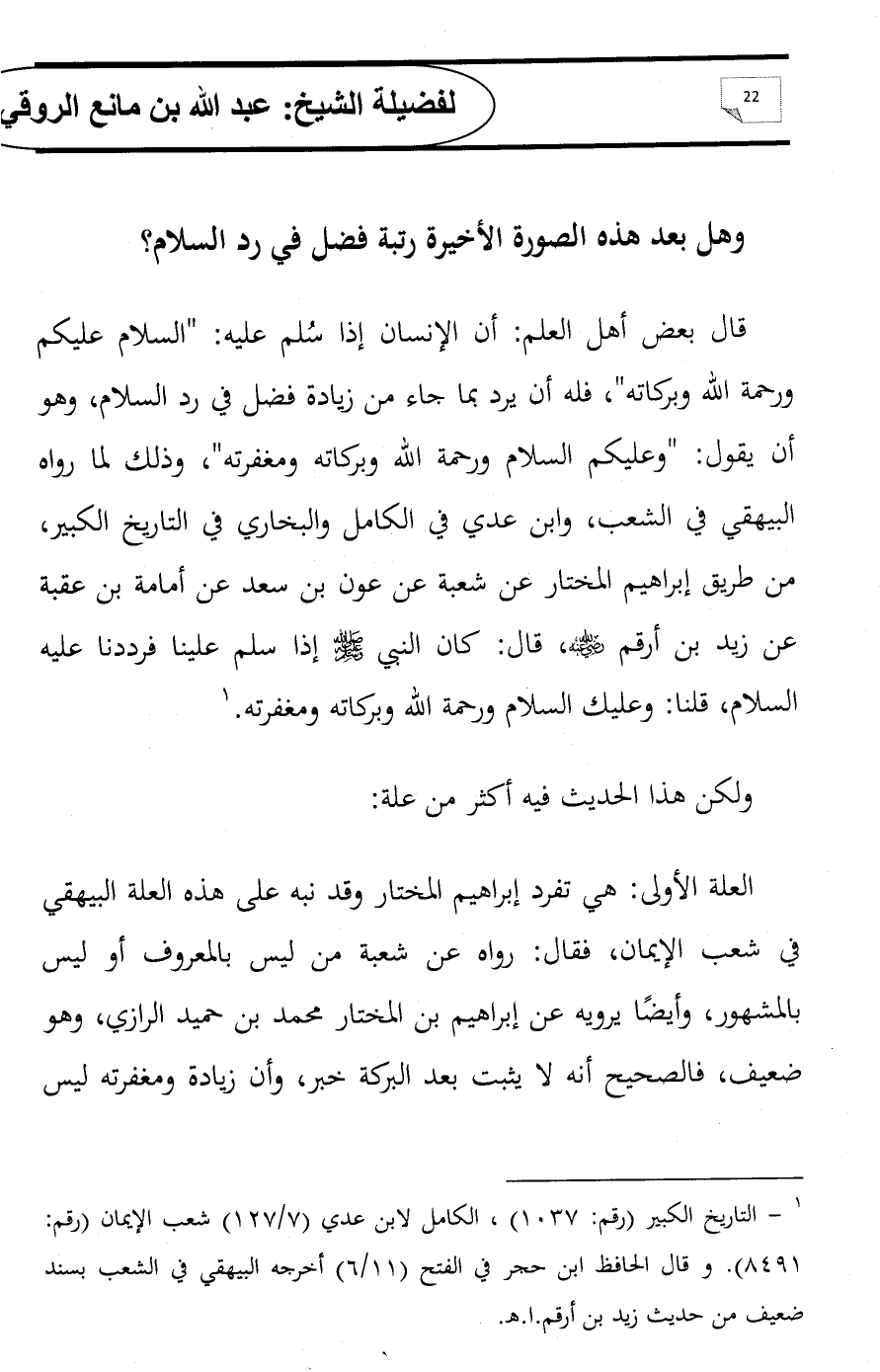 قال بعض أهل العلم: أن الإنسان إذا سُلم عليه: "السلام عليكم ورحمة الله وبركاته", فله أن يرد بما جاء من زيادة فضل في رد السلام, وهو أن يقول: "وعليكم السلام ورحمة الله وبركاته ومغفرته", وذلك لما رواه البيهقي في الشعب, وابن عدي في الكامل والبخاري في التاريخ الكبير, من طريق إبراهيم المختار عن شعبة عن عون بن سعد عن أمامة بن عقبة عن زيد بن أرقم - رضي الله عنه -، قال: كان النبي - صلى الله عليه وسلم - إذا سلم علينا فرددنا عليه السلام، قلنا: وعليك السلام ورحمة الله وبركاته ومغفرته. (¬1)