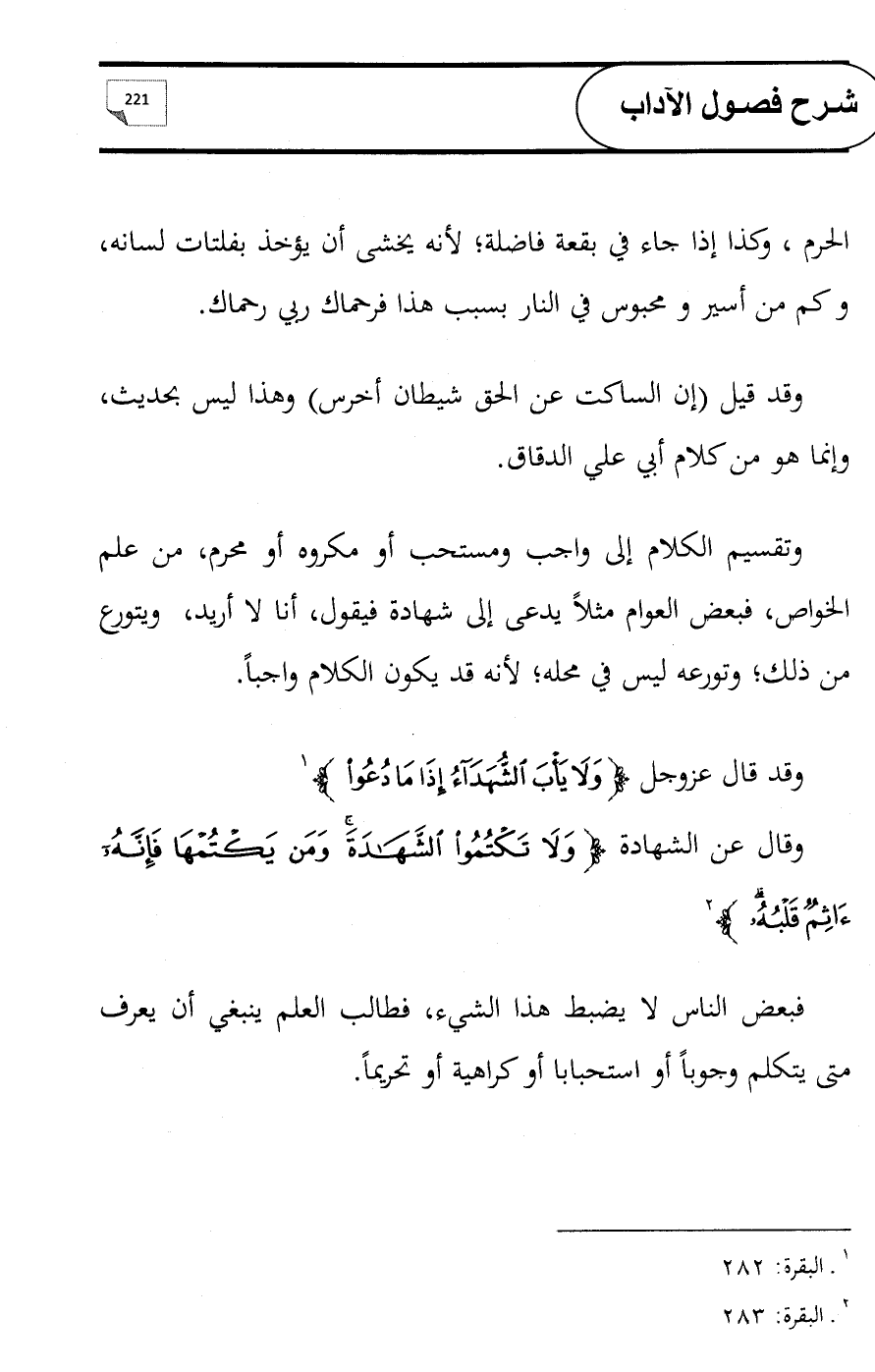 وتقسيم الكلام إلى واجب ومستحب أو مكروه أو محرم، من علم الخواص، فبعض العوام مثلاً يدعى إلى شهادة فيقول، أنا لا أريد، ويتورع من ذلك؛ وتورعه ليس في محله؛ لأنه قد يكون الكلام واجباً.