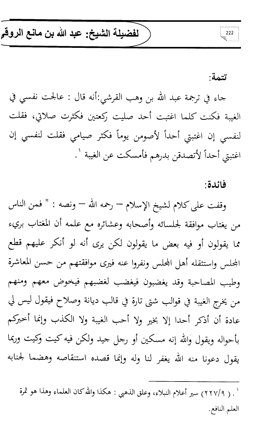 جاء في ترجمة عبد الله بن وهب القرشي: أنه قال: عالجت نفسي في الغيبة فكنت كلما اغتبت أحد صليت ركعتين فكثرت صلاتي، فقلت لنفسي إن اغتبتي أحداً لأصومن يوماً فكثر صيامي فقلت لنفسي إن اغتبتي أحداً لأتصدقن بدرهم فأمسكت عن الغيبة (¬1).