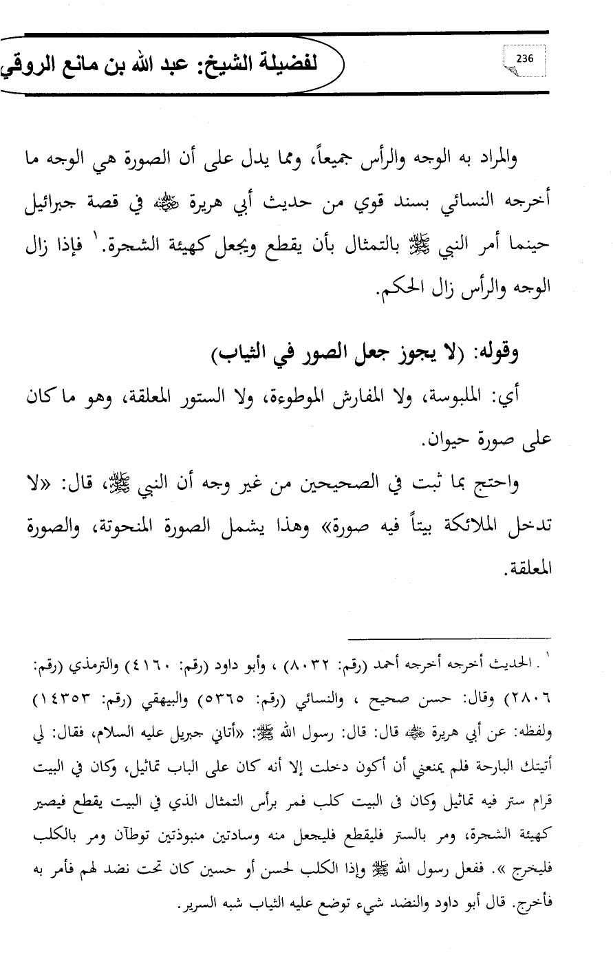 (¬1) الحديث أخرجه أخرجه أحمد (رقم: 8032)، وأبو داود (رقم: 4160) والترمذي (رقم: 2806) وقال: حسن صحيح، والنسائي (رقم: 5365) والبيهقي (رقم: 14353) ولفظه: عن أبي هريرة - رضي الله عنه - قال: قال: رسول الله - صلى الله عليه وسلم -: «أتاني جبريل عليه السلام، فقال: لي أتيتك البارحة فلم يمنعني أن أكون دخلت إلا أنه كان على الباب تماثيل، وكان في البيت قرام ستر فيه تماثيل وكان فى البيت كلب فمر برأس التمثال الذي في البيت يقطع فيصير كهيئة الشجرة، ومر بالستر فليقطع فليجعل منه وسادتين منبوذتين توطآن ومر بالكلب فليخرج». ففعل رسول الله - صلى الله عليه وسلم - وإذا الكلب لحسن أو حسين كان تحت نضد لهم فأمر به فأخرج. قال أبو داود والنضد شيء توضع عليه الثياب شبه السرير.