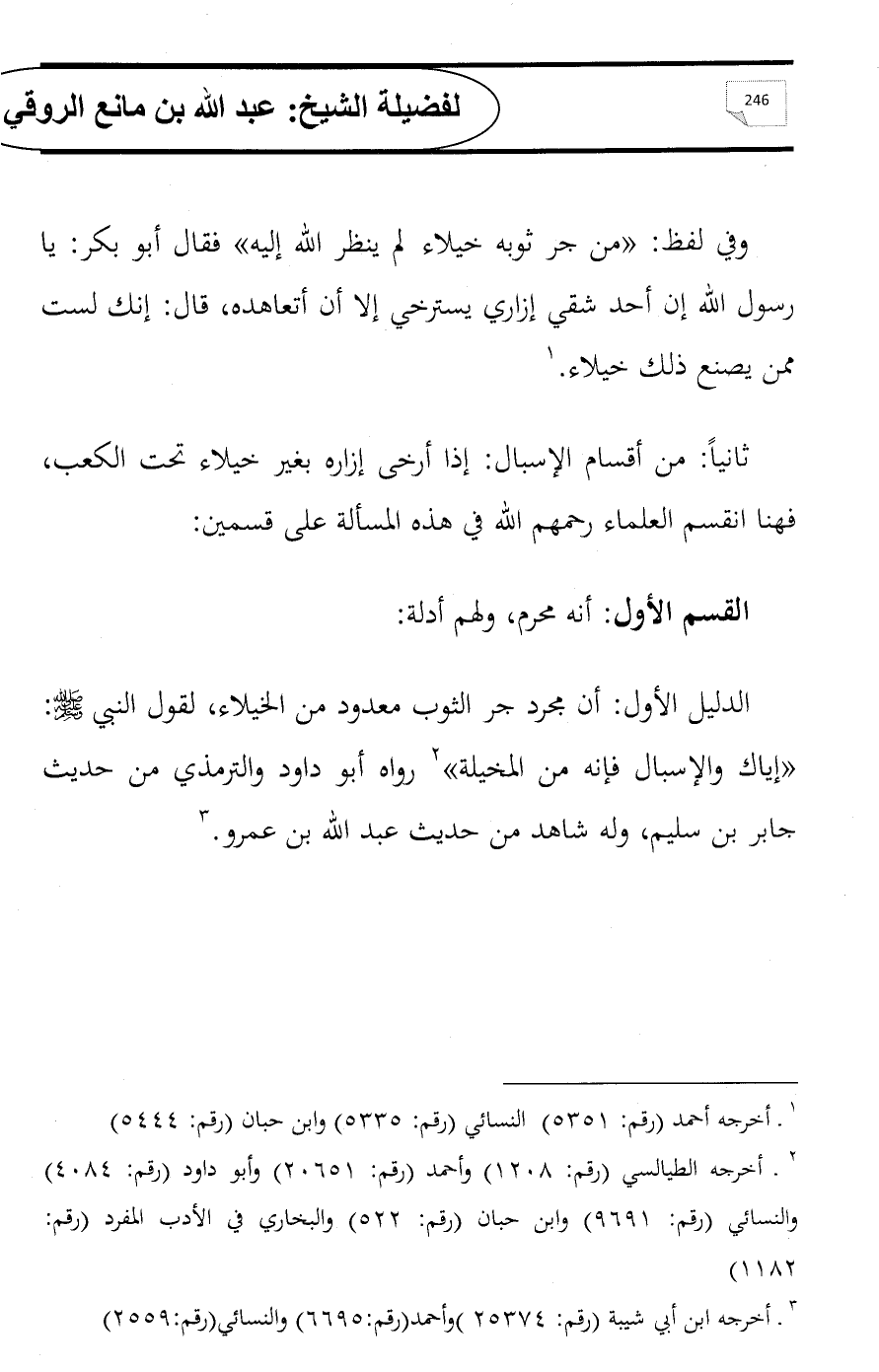 الدليل الأول: أن مجرد جر الثوب معدود من الخيلاء, لقول النبي - صلى الله عليه وسلم -: «إياك والإسبال فإنه من المخيلة» (¬2) رواه أبو داود والترمذي من حديث جابر بن سليم, وله شاهد من حديث عبد الله بن عمرو. (¬3)