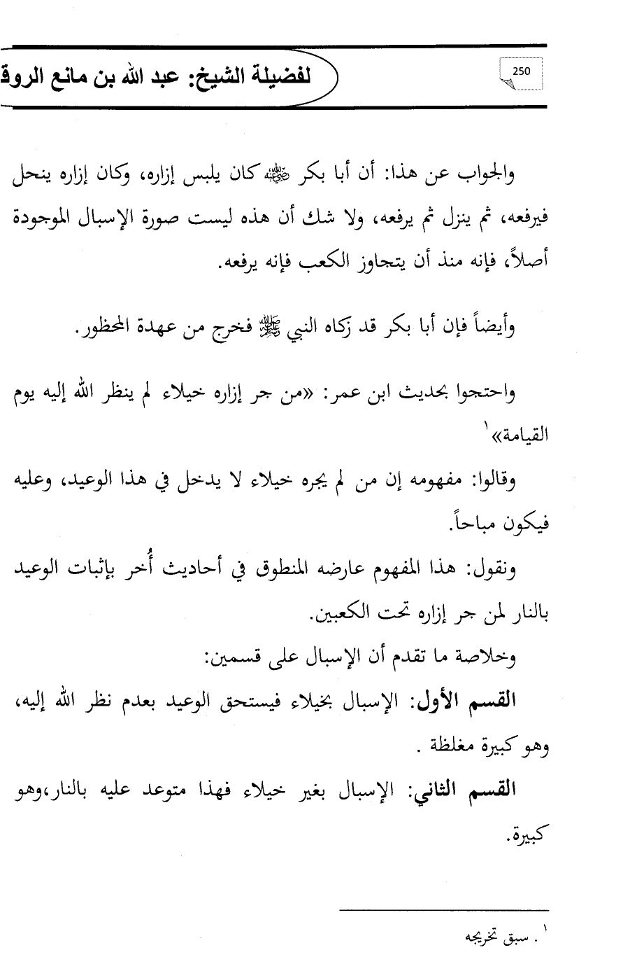 والجواب عن هذا: أن أبا بكر - رضي الله عنه - كان يلبس إزاره, وكان إزاره ينحل فيرفعه, ثم ينزل ثم يرفعه, ولا شك أن هذه ليست صورة الإسبال الموجودة أصلاً, فإنه منذ أن يتجاوز الكعب فإنه يرفعه.