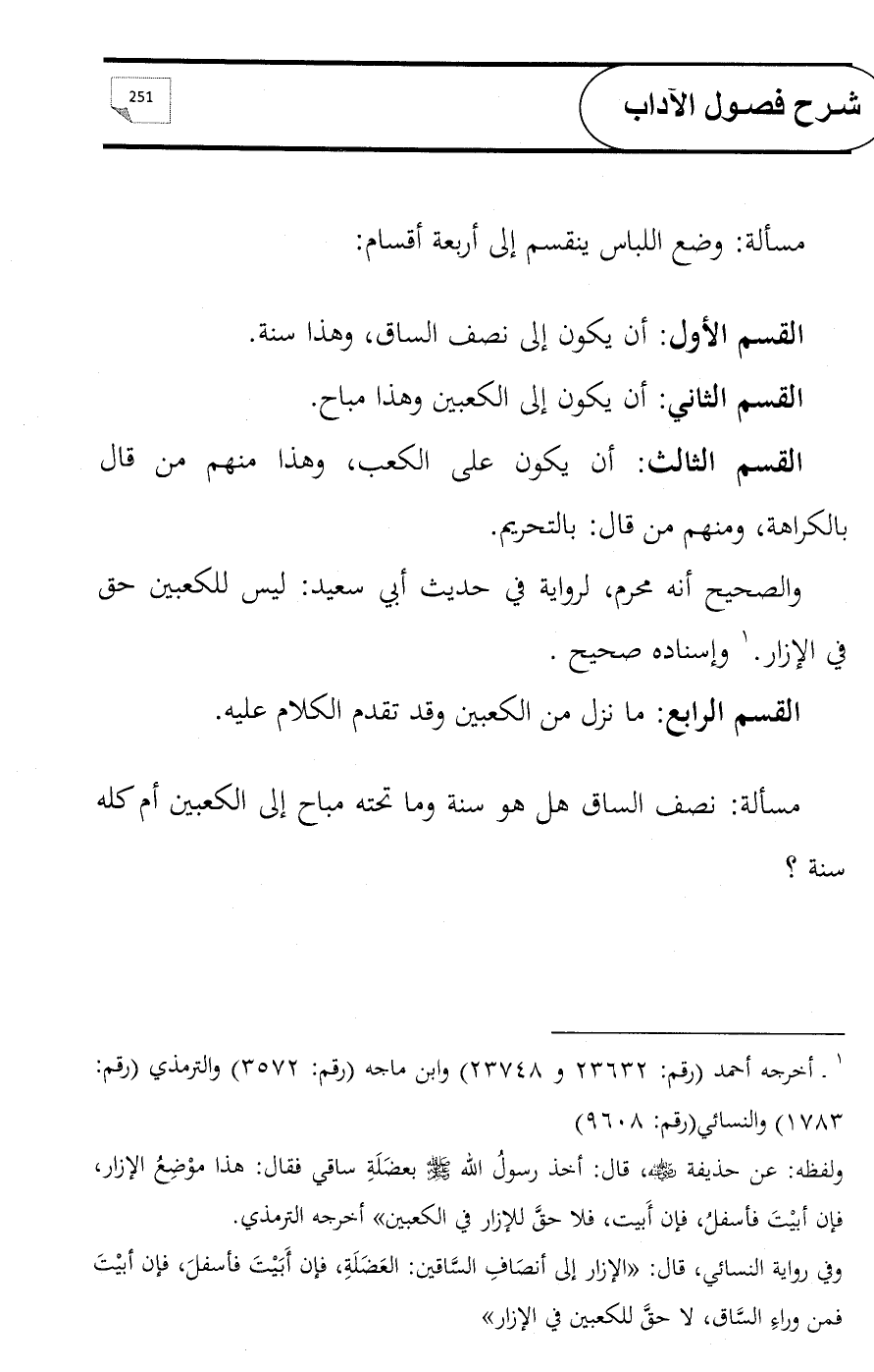 مسألة: نصف الساق هل هو سنة وما تحته مباح إلى الكعبين أم كله سنة؟