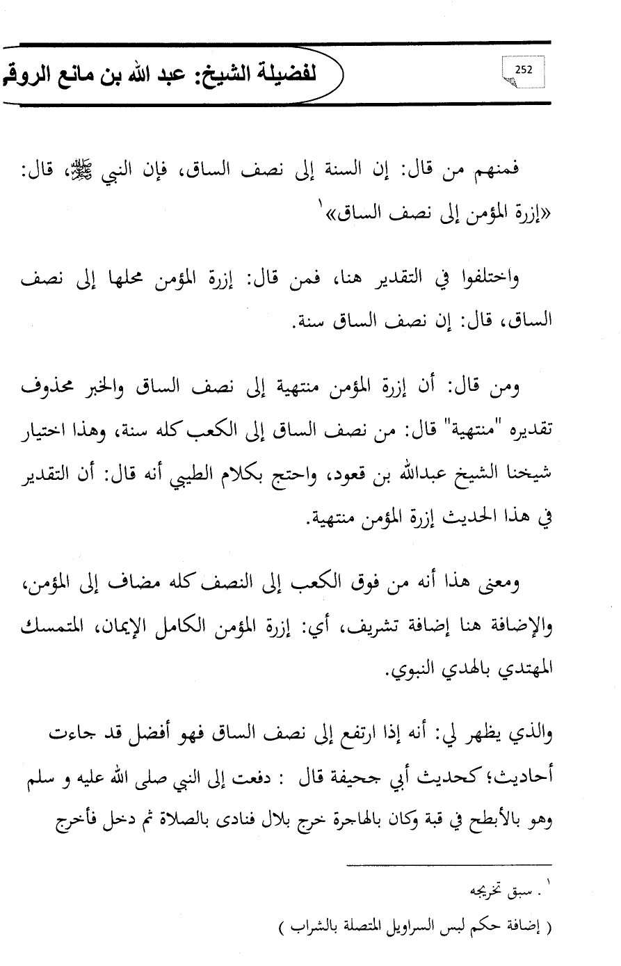 ومن قال: أن إزرة المؤمن منتهية إلى نصف الساق والخبر محذوف تقديره "منتهية" قال: من نصف الساق إلى الكعب كله سنة, وهذا اختيار شيخنا الشيخ عبدالله بن قعود، واحتج بكلام الطيبي أنه قال: أن التقدير في هذا الحديث إزرة المؤمن منتهية.