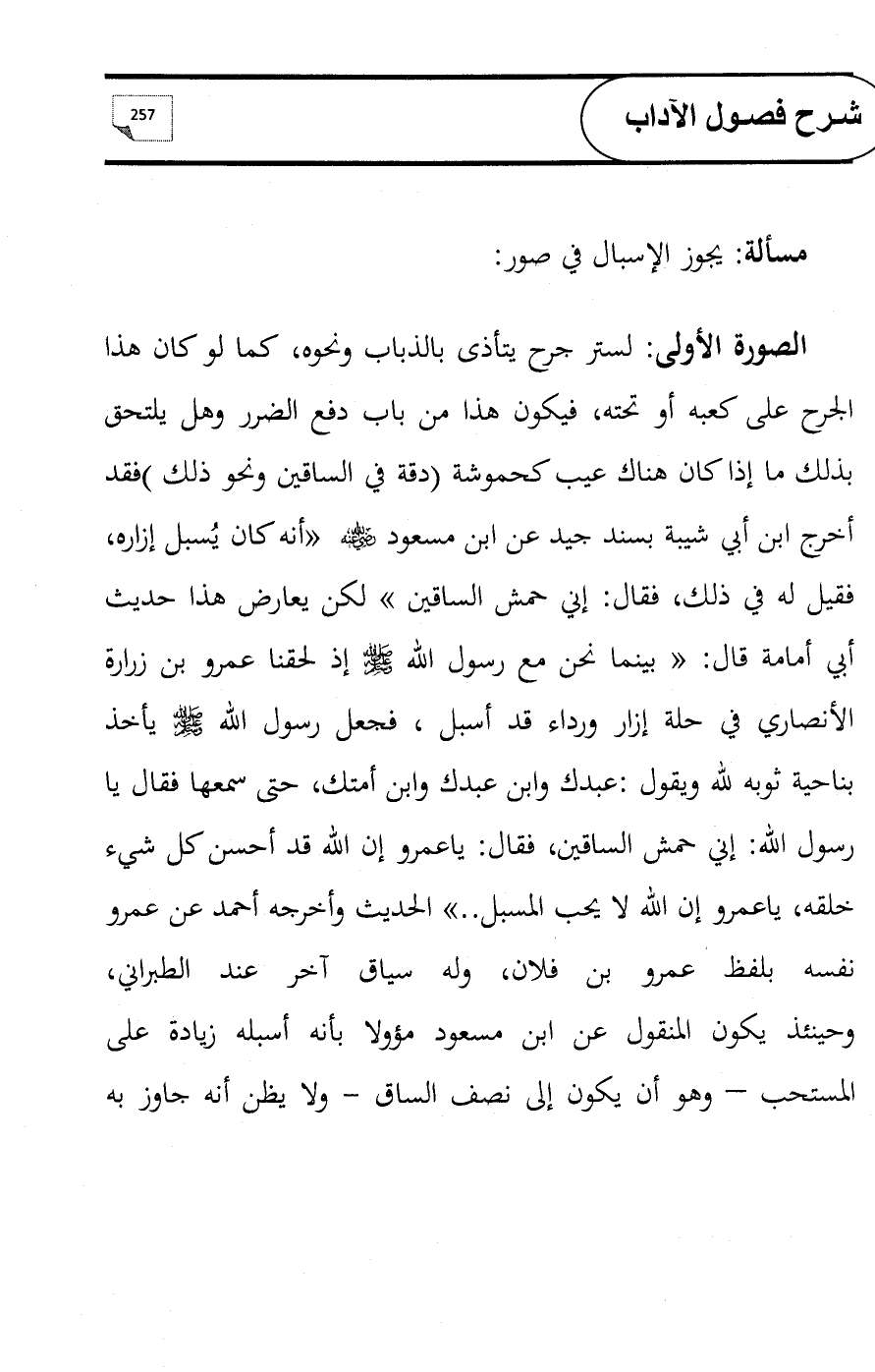 الصورة الأولى: لستر جرح يتأذى بالذباب ونحوه, كما لو كان هذا الجرح على كعبه أو تحته, فيكون هذا من باب دفع الضرر وهل يلتحق بذلك ما إذا كان هناك عيب كحموشة (دقة في الساقين ونحو ذلك) فقد أخرج ابن أبي شيبة بسند جيد عن ابن مسعود - رضي الله عنه - «أنه كان يُسبل إزاره, فقيل له في ذلك, فقال: إني حمش الساقين» لكن يعارض هذا حديث أبي أمامة قال: «بينما نحن مع رسول الله - صلى الله عليه وسلم - إذ لحقنا عمرو بن زرارة الأنصاري في حلة إزار ورداء قد أسبل , فجعل رسول الله - صلى الله عليه وسلم - يأخذ بناحية ثوبه لله ويقول: عبدك وابن عبدك وابن أمتك, حتى سمعها فقال يا رسول الله: إني حمش الساقين ,فقال: ياعمرو إن الله قد أحسن كل شيء خلقه، ياعمرو إن الله لا يحب المسبل ..» الحديث وأخرجه أحمد عن عمرو نفسه بلفظ عمرو بن فلان, وله سياق آخر عند الطبراني، ... وحينئذ يكون المنقول عن ابن مسعود مؤولا بأنه أسبله زيادة على المستحب - وهو أن يكون إلى نصف الساق - ولا يظن أنه جاوز به