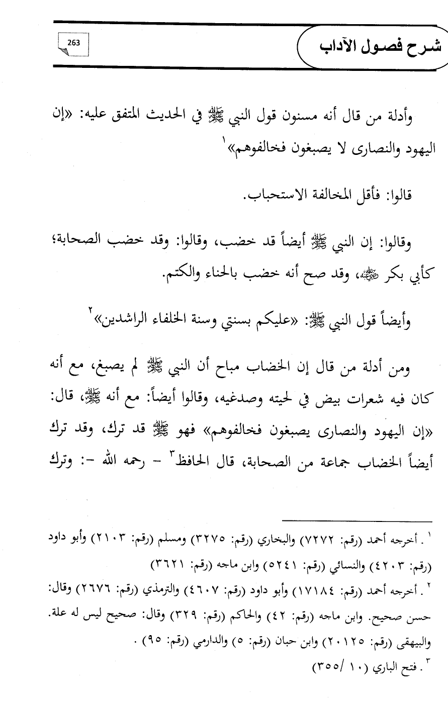 ومن أدلة من قال إن الخضاب مباح أن النبي - صلى الله عليه وسلم - لم يصبغ, مع أنه كان فيه شعرات بيض في لحيته وصدغيه, وقالوا أيضاً: مع أنه - صلى الله عليه وسلم -، قال: «إن اليهود والنصارى يصبغون فخالفوهم» فهو - صلى الله عليه وسلم - قد ترك, وقد ترك أيضاً الخضاب جماعة من الصحابة, قال الحافظ (¬3) - رحمه الله -: وترك