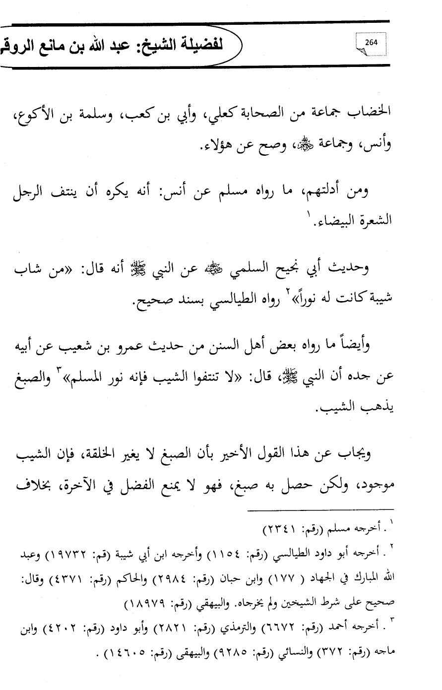 وحديث أبي نجيح السلمي - رضي الله عنه - عن النبي - صلى الله عليه وسلم - أنه قال: «من شاب شيبة كانت له نوراً» (¬2) رواه الطيالسي بسند صحيح.