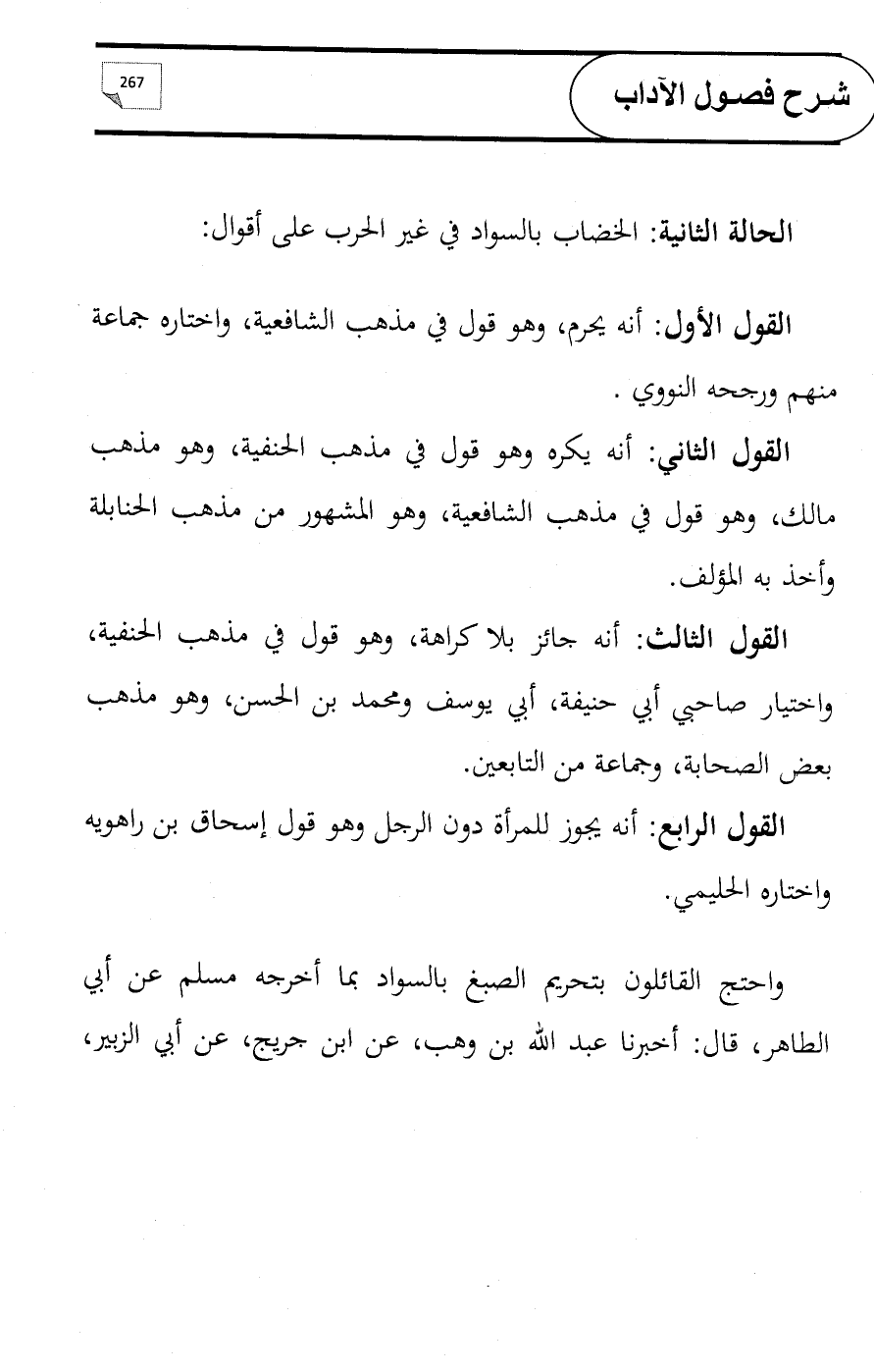 واحتج القائلون بتحريم الصبغ بالسواد بما أخرجه مسلم عن أبي الطاهر، قال: أخبرنا عبد الله بن وهب، عن ابن جريج، عن أبي الزبير،