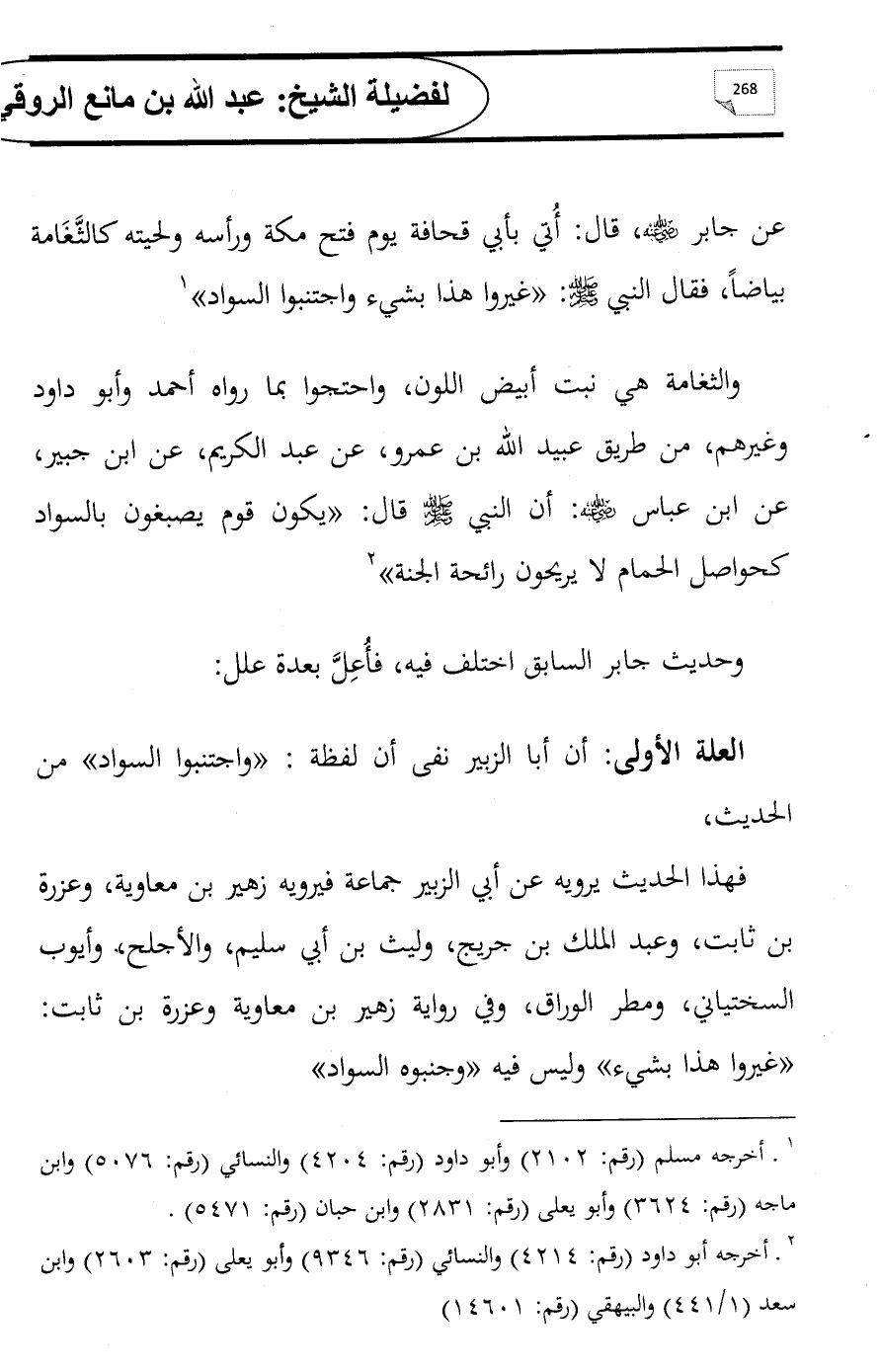 فهذا الحديث يرويه عن أبي الزبير جماعة فيرويه زهير بن معاوية, وعزرة بن ثابت, وعبد الملك بن جريج, وليث بن أبي سليم, والأجلح, وأيوب السختياني, ومطر الوراق, وفي رواية زهير بن معاوية وعزرة بن ثابت: «غيروا هذا بشيء» وليس فيه «وجنبوه السواد»