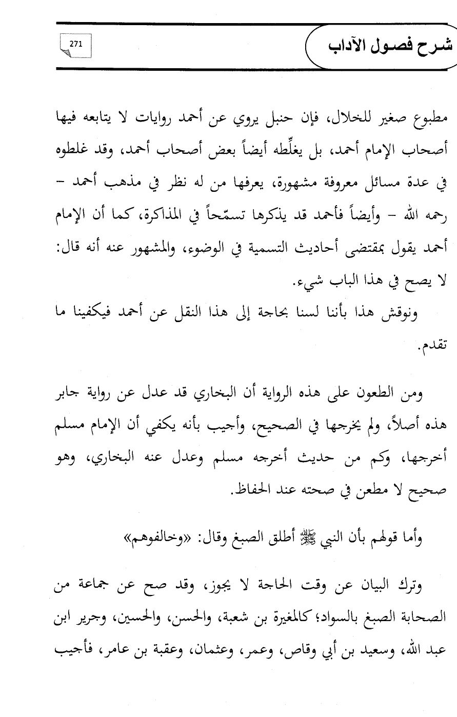 مطبوع صغير للخلال, فإن حنبل يروي عن أحمد روايات لا يتابعه فيها أصحاب الإمام أحمد, بل يغلِّطه أيضاً بعض أصحاب أحمد, وقد غلطوه في عدة مسائل معروفة مشهورة، يعرفها من له نظر في مذهب أحمد - رحمه الله - وأيضاً فأحمد قد يذكرها تسمّحاً في المذاكرة، كما أن الإمام أحمد يقول بمقتضى أحاديث التسمية في الوضوء, والمشهور عنه أنه قال: لا يصح في هذا الباب شيء.