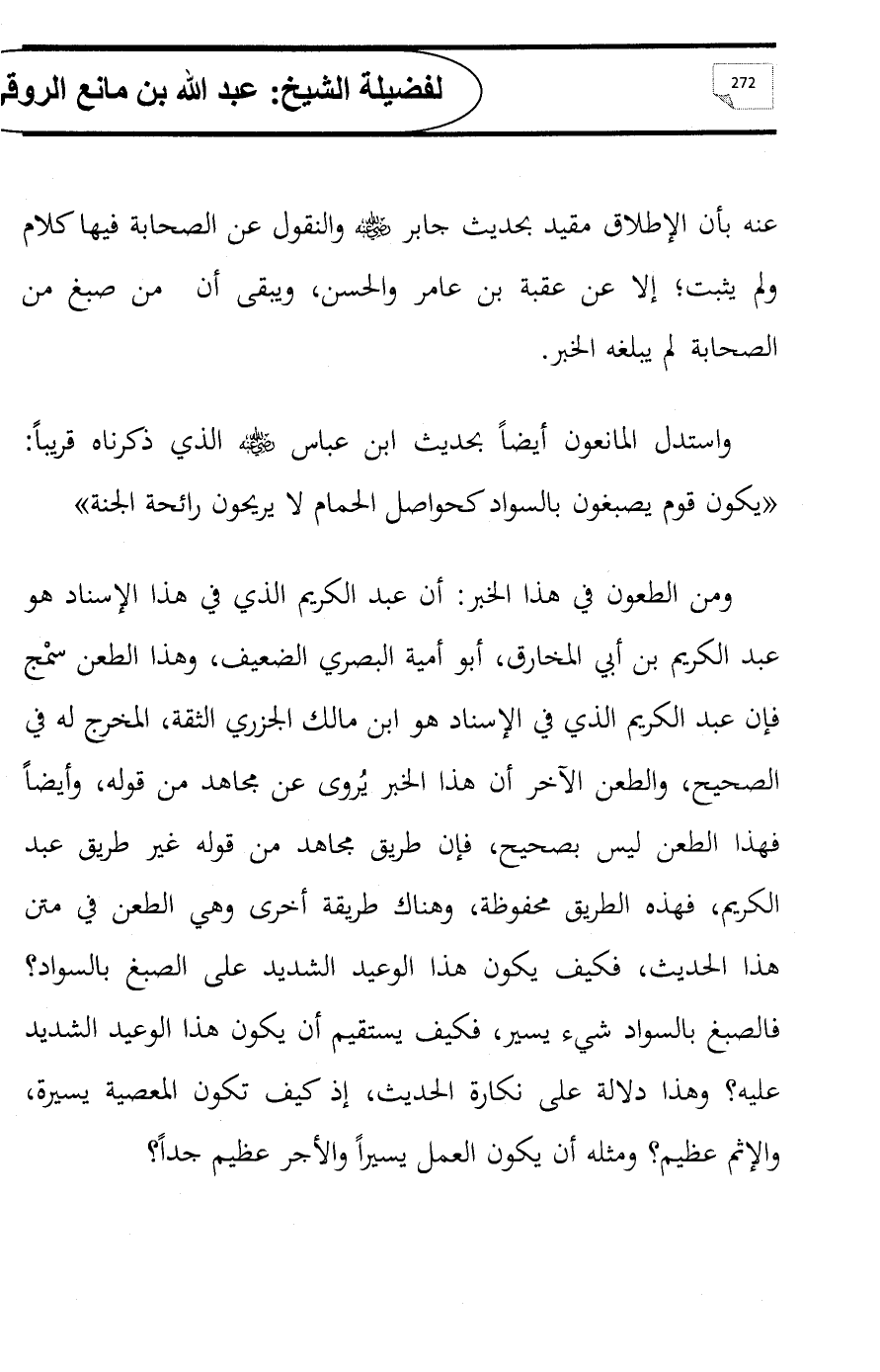 ومن الطعون في هذا الخبر: أن عبد الكريم الذي في هذا الإسناد هو عبد الكريم بن أبي المخارق, أبو أمية البصري الضعيف, وهذا الطعن سمْج فإن عبد الكريم الذي في الإسناد هو ابن مالك الجزري الثقة, المخرج له في الصحيح, والطعن الآخر أن هذا الخبر يُروى عن مجاهد من قوله, وأيضاً فهذا الطعن ليس بصحيح, فإن طريق مجاهد من قوله غير طريق عبد الكريم, فهذه الطريق محفوظة, وهناك طريقة أخرى وهي الطعن في متن هذا الحديث, فكيف يكون هذا الوعيد الشديد على الصبغ بالسواد؟ فالصبغ بالسواد شيء يسير, فكيف يستقيم أن يكون هذا الوعيد الشديد عليه؟ وهذا دلالة على نكارة الحديث, إذ كيف تكون المعصية يسيرة, والإثم عظيم؟ ومثله أن يكون العمل يسيراً والأجر عظيم جداً؟