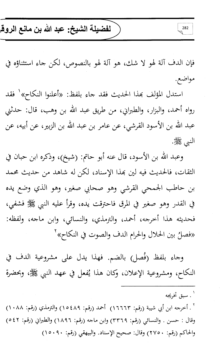 وعبد الله بن الأسود، قال عنه أبو حاتم: (شيخ) , وذكره ابن حبان في الثقات, فالحديث فيه لين بهذا الإسناد, لكن له شاهد من حديث محمد بن حاطب الجمحي القرشي وهو صحابي صغير, وهو الذي وضع يده في القدر وهو صغير في المرق فاحترقت يده، وقرأ عليه النبي - صلى الله عليه وسلم - فشفي، فحديثه هذا أخرجه، أحمد، والترمذي، والنسائي، وابن ماجه، ولفظه: «فصلُ بين الحلال والحرام الدف والصوت في النكاح» (¬2)