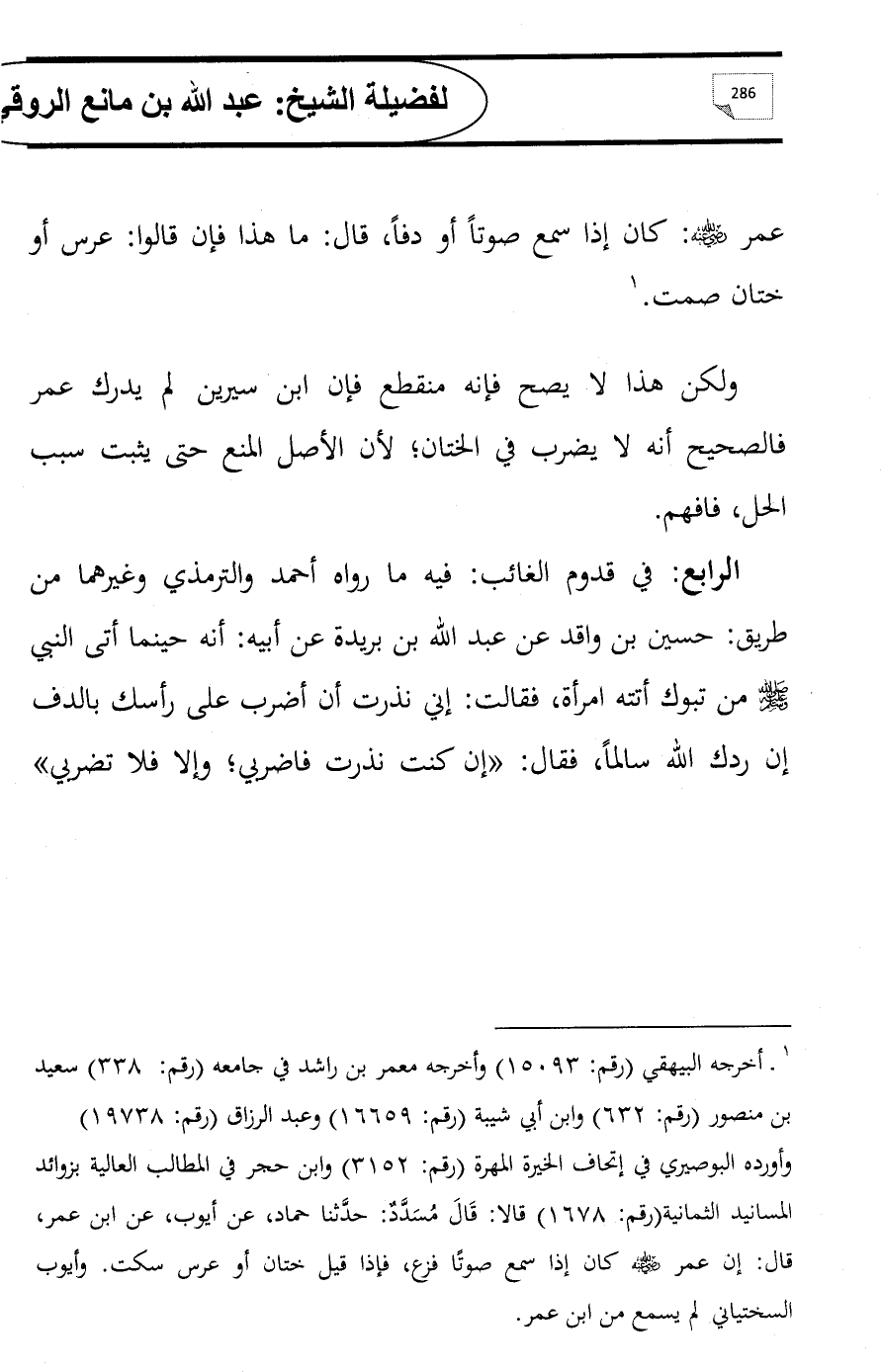 الرابع: في قدوم الغائب: فيه ما رواه أحمد والترمذي وغيرهما من طريق: حسين بن واقد عن عبد الله بن بريدة عن أبيه: أنه حينما أتى النبي - صلى الله عليه وسلم - من تبوك أتته امرأة، فقالت: إني نذرت أن أضرب على رأسك بالدف إن ردك الله سالماً، فقال: «إن كنت نذرت فاضربي؛ وإلا فلا تضربي»